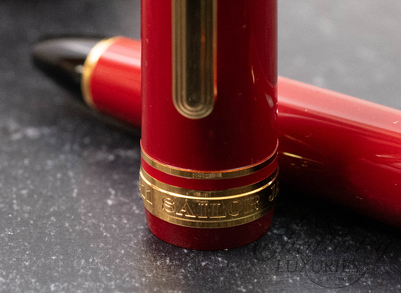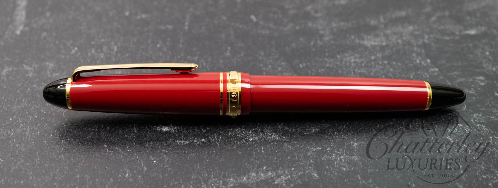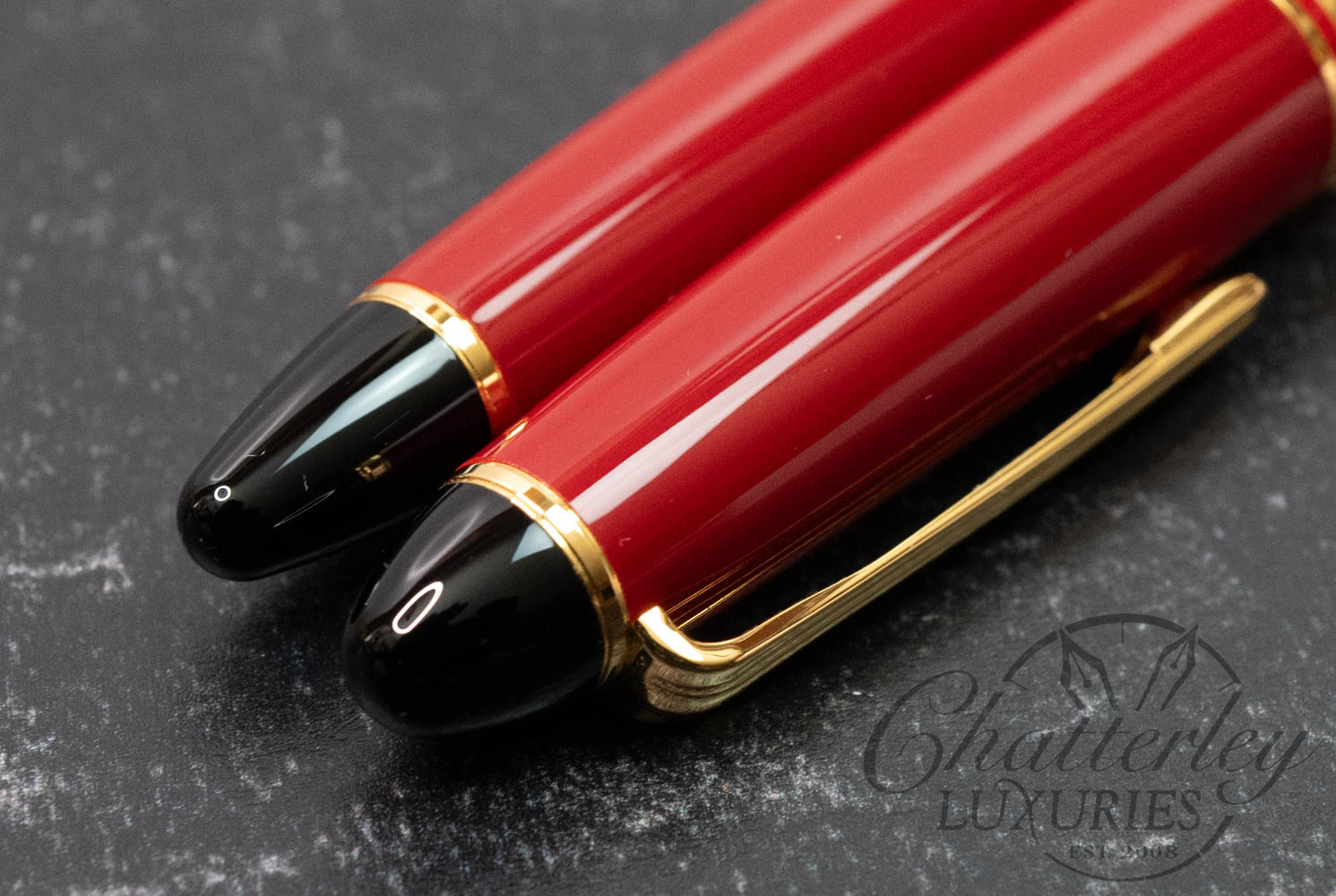 This pen is lovingly used and comes with a box and papers. It is equipped with a 14k Hard-Extra Fine nib and fills via a Cartridge/Cartridge Converter (included). This pen is slightly closer to the burgundy side of the red spectrum, we try to depict the color perfect, and this case, its very close. Just slightly brighter in the pictures than in real life.