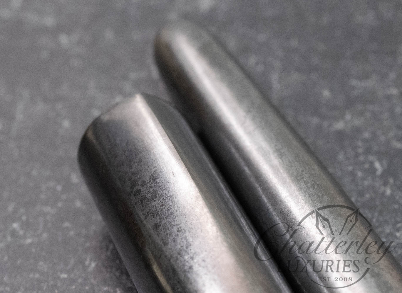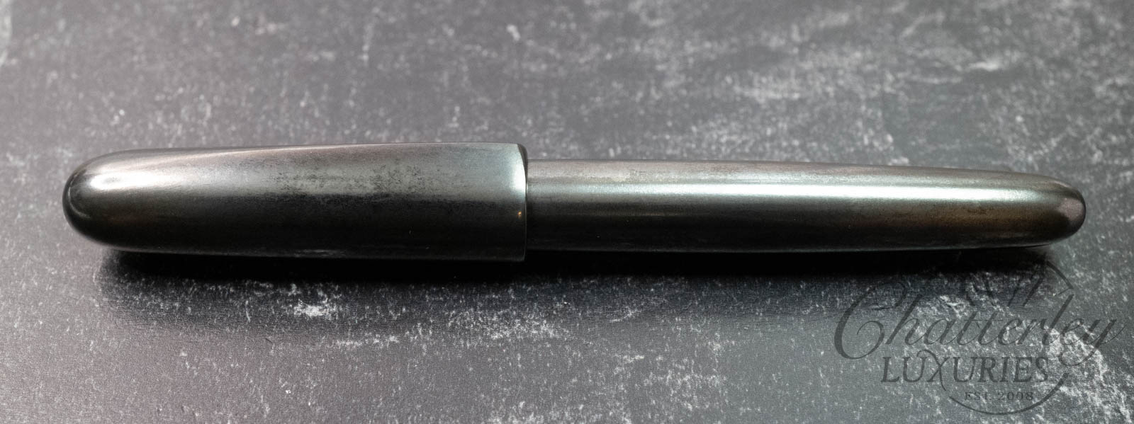 The NAWATE Fountain Pen Kuroginhaku collection presents Sei ( 惺) in a lustrous glossy finish and Ei ( 影) in a refined matte finish. Layers of Urushi lacquer are brushed in irregular strokes, upon which Kuroginhaku—black silver foil—is delicately and purposefully scattered.