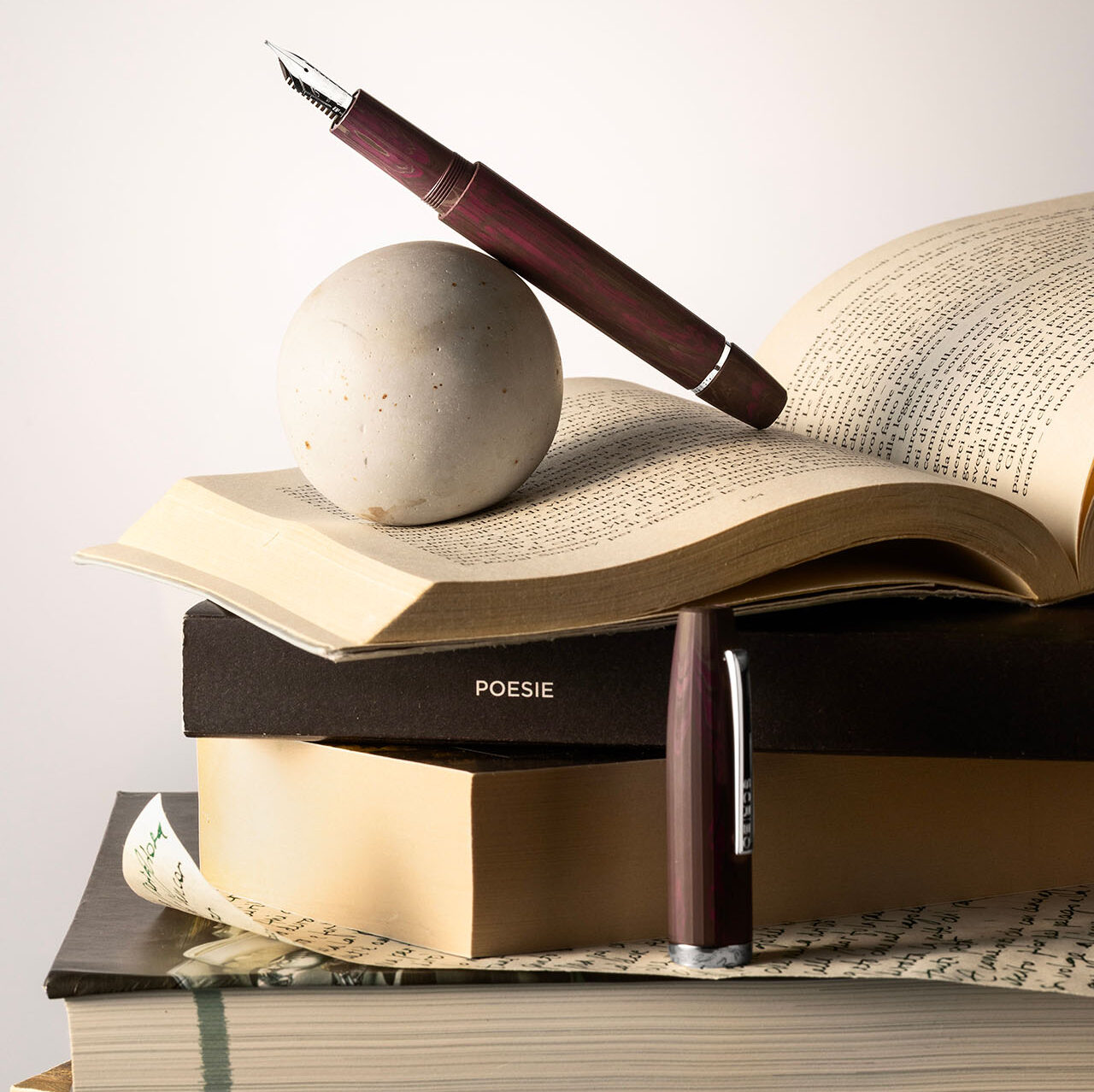 Armonia is balance made visible —beauty in form, grace in motion. Its purples shift from light to dark like the bark of ancient trees, whispering of roots and resonance, of a perfect dialogue between pen and hand. Produced in a limited edition of 88 pieces.