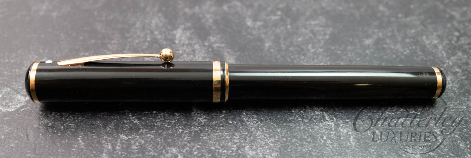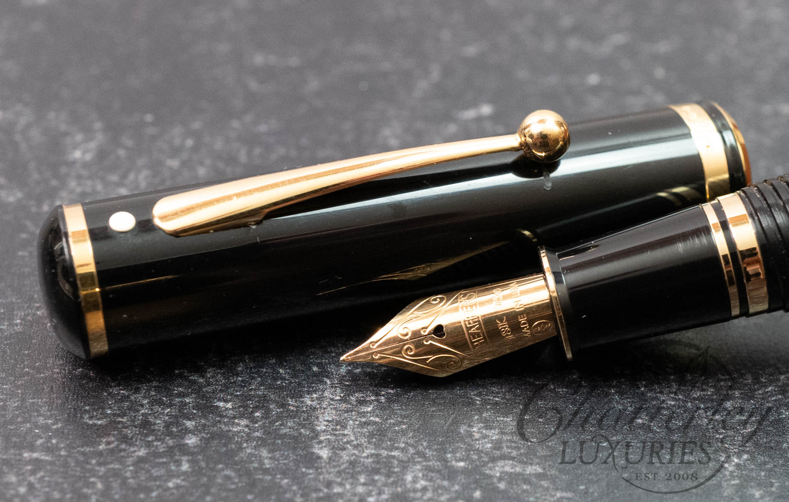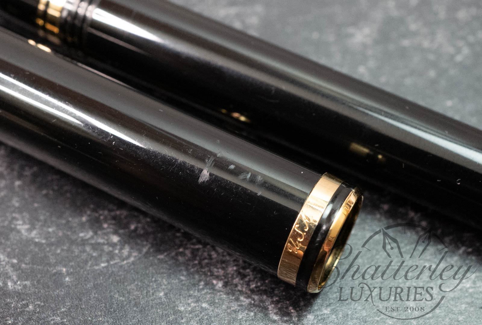 This pen has seen regular use and shows noticeable wear throughout, with clear signs of handling and surface wear. It does not come with a box or papers and is equipped with an 18k Fine nib. It fills via a Squeeze Fill Convertor. There are some scratches on the back of the cap (see last image).