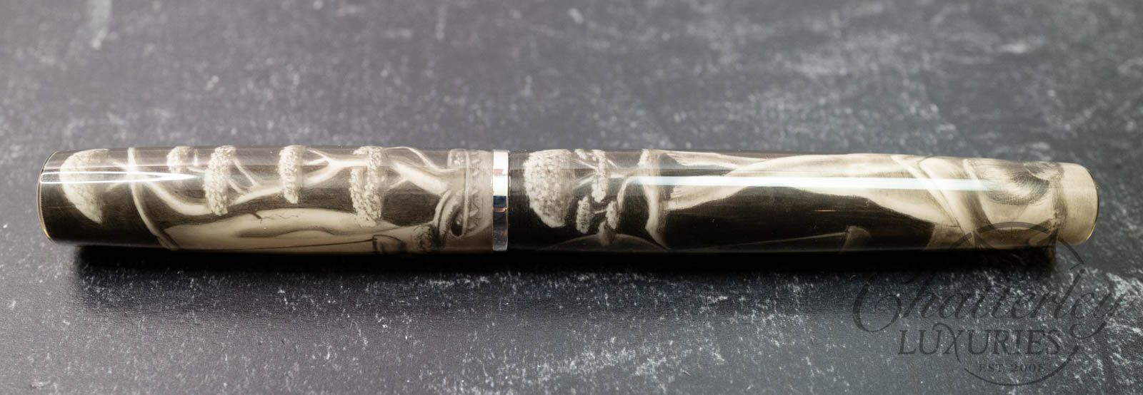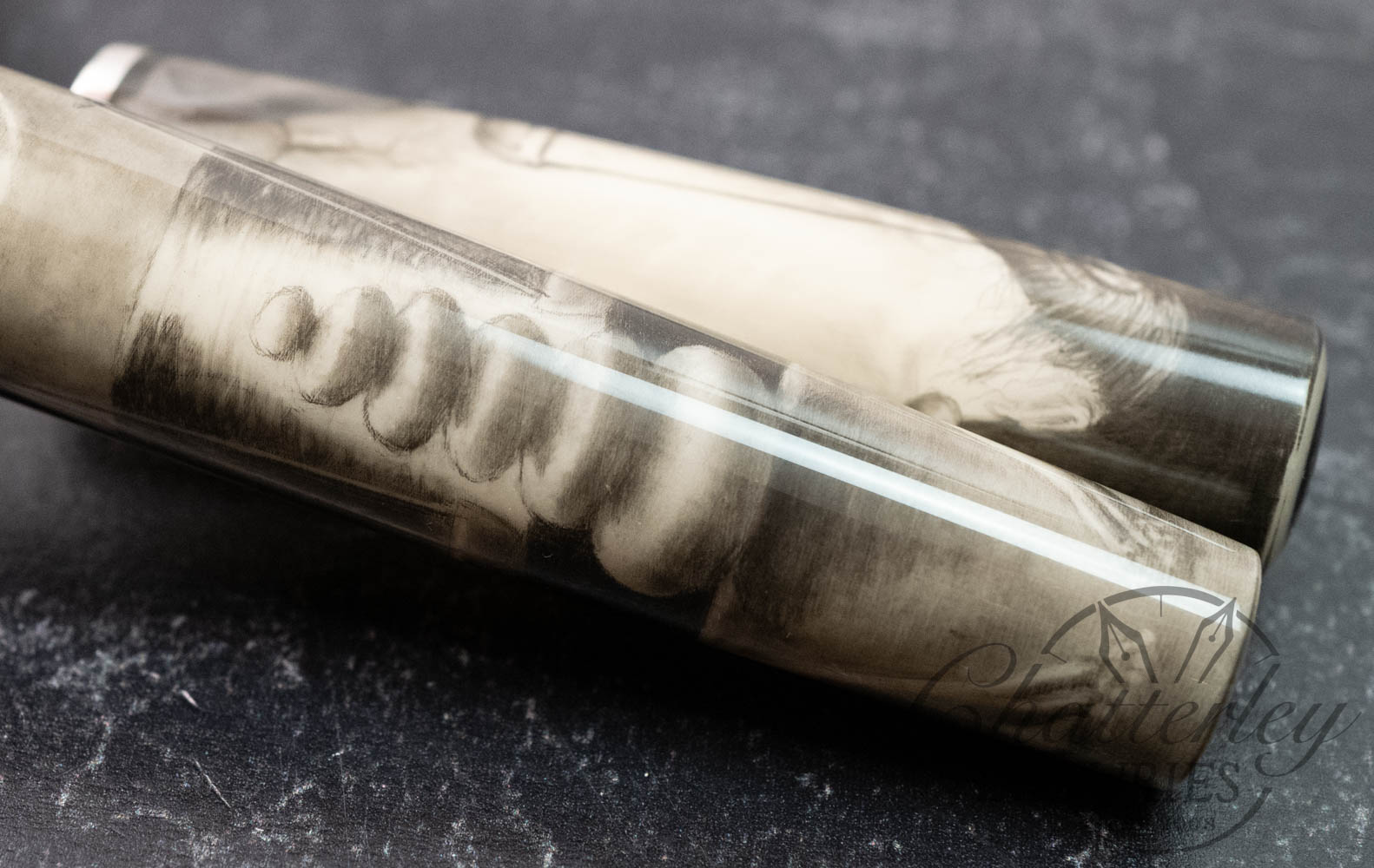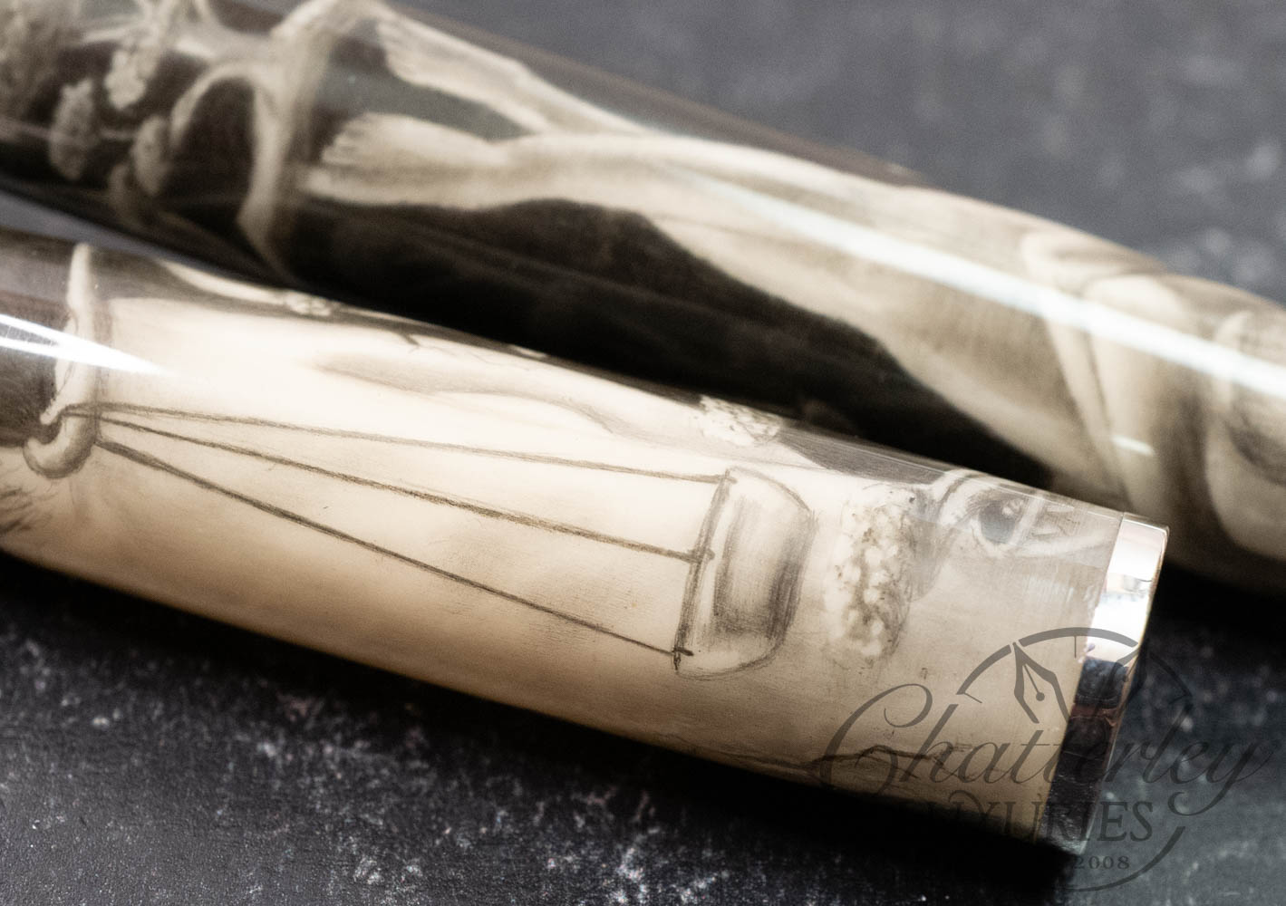 Self-taught artist Brandon Lodewyk drew the Balance in pencil, ranging from 2B to 12B. (The photographs show the pen in ‘color’ and again in black and white, as the monochrome effect shows the details to better effect.) This pen was made by us at Stanford Pen Studio, illustrated by Brandon in graphite, then coated in a clear resin and given its final shape, polished, and buffed. We have added a black grip section, as well as a silver section ring, and our logo medallion (in silver) embedded in the cap finial.