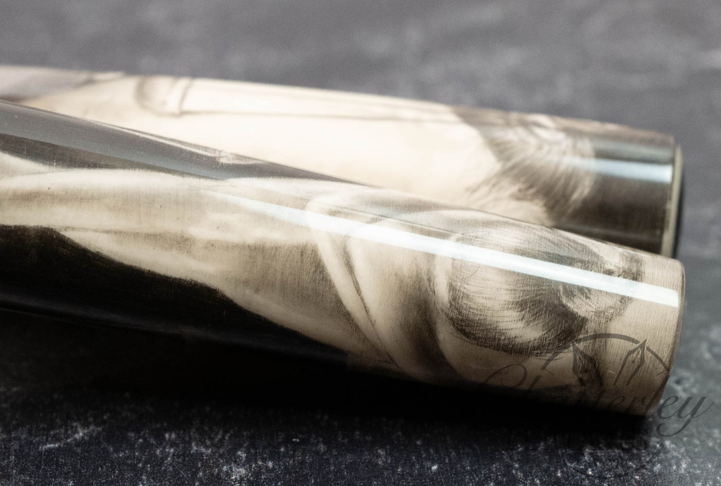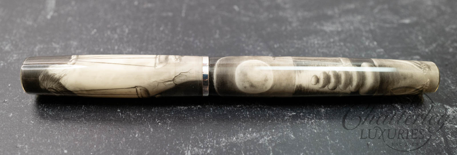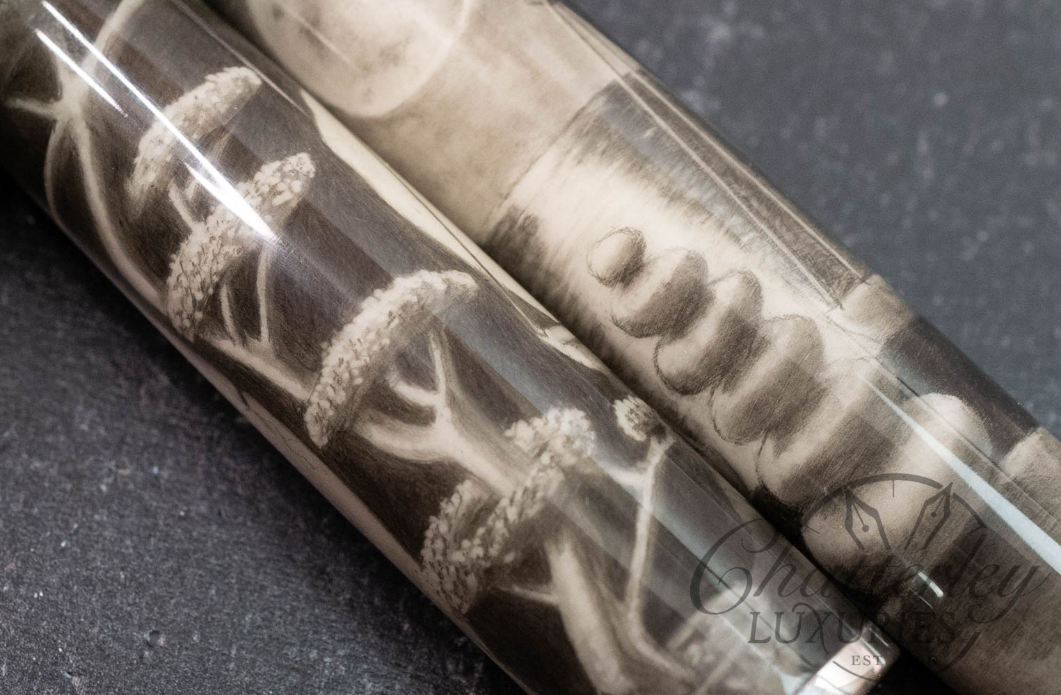 Self-taught artist Brandon Lodewyk drew the Balance in pencil, ranging from 2B to 12B. (The photographs show the pen in ‘color’ and again in black and white, as the monochrome effect shows the details to better effect.) This pen was made by us at Stanford Pen Studio, illustrated by Brandon in graphite, then coated in a clear resin and given its final shape, polished, and buffed. We have added a black grip section, as well as a silver section ring, and our logo medallion (in silver) embedded in the cap finial.