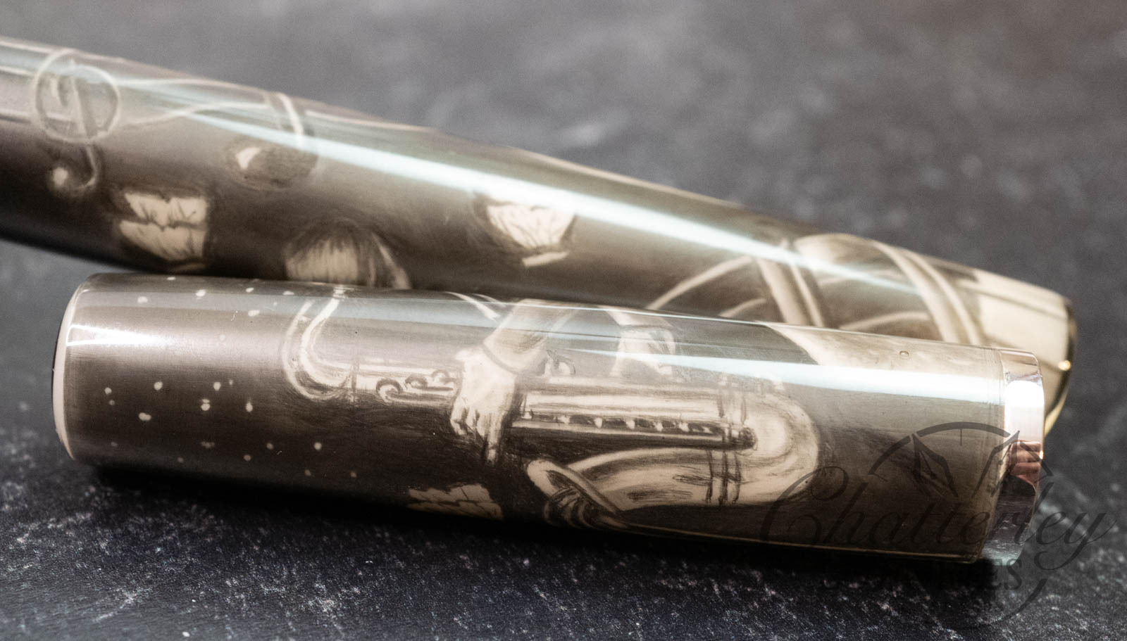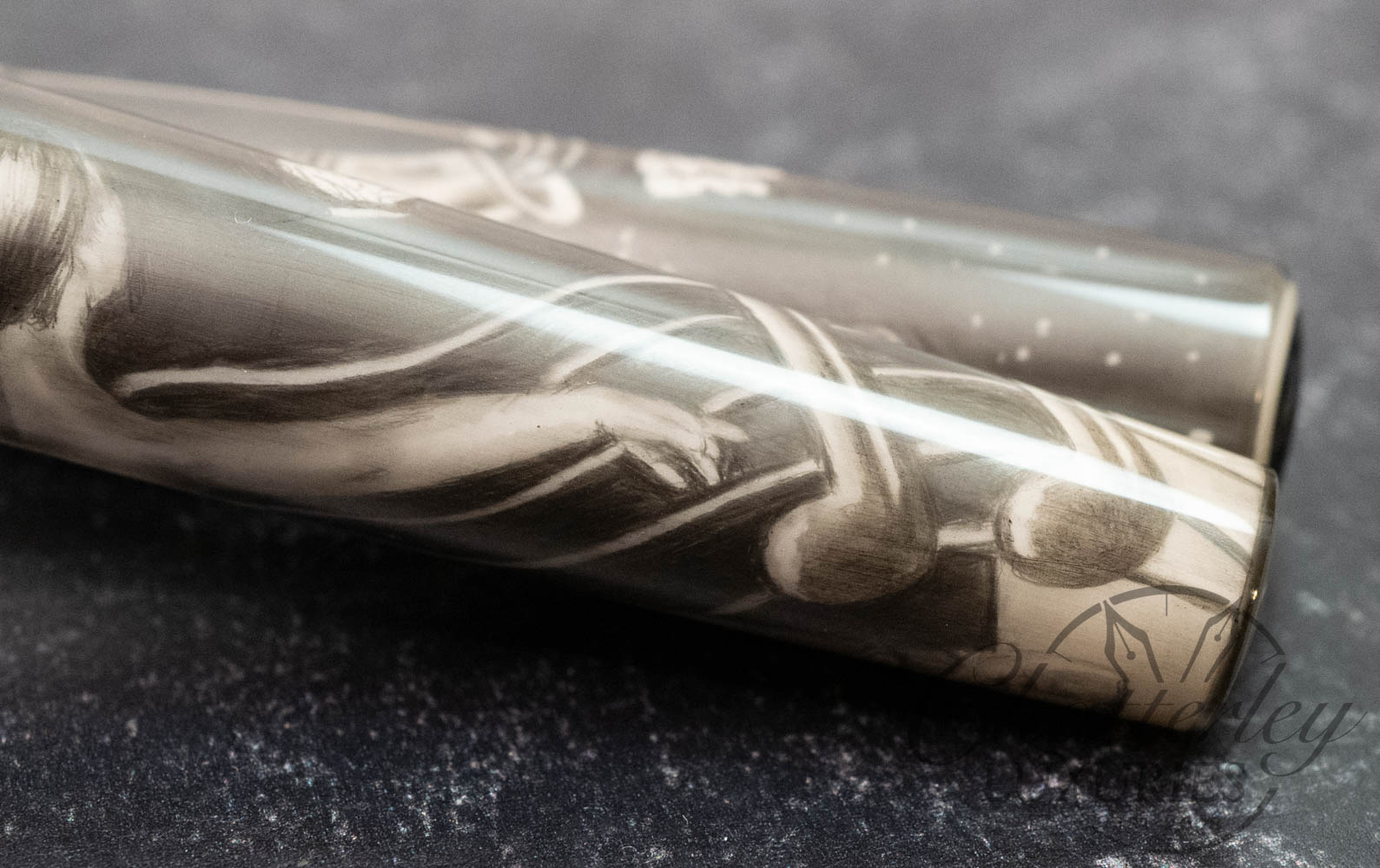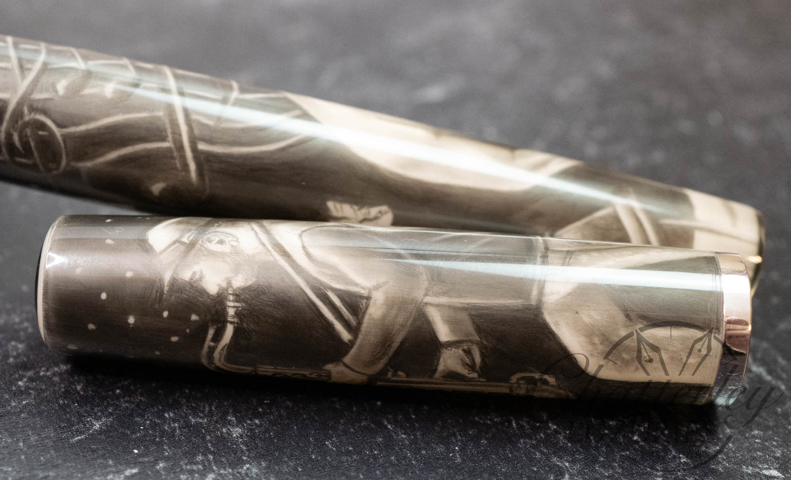 Self-taught artist Brandon Lodewyk drew the Balance in pencil, ranging from 2B to 12B. (The photographs show the pen in ‘color’ and again in black and white, as the monochrome effect shows the details to better effect.) This pen was made by us at Stanford Pen Studio, illustrated by Brandon in graphite, then coated in a clear resin and given its final shape, polished, and buffed. We have added a black grip section, as well as a silver section ring, and our logo medallion (in silver) embedded in the cap finial.