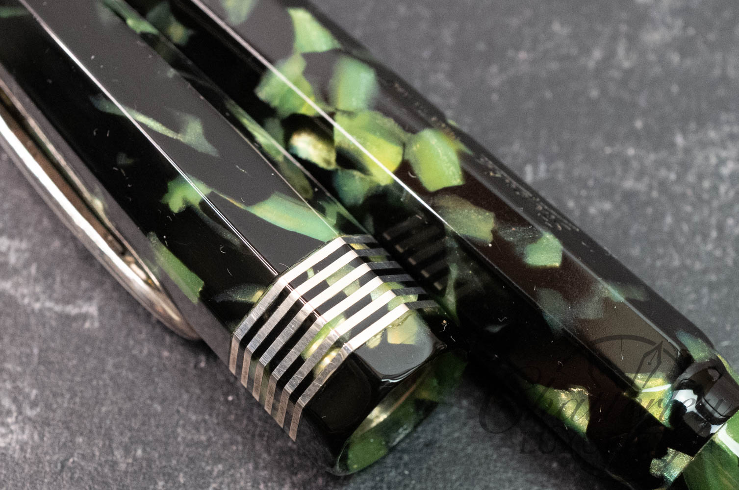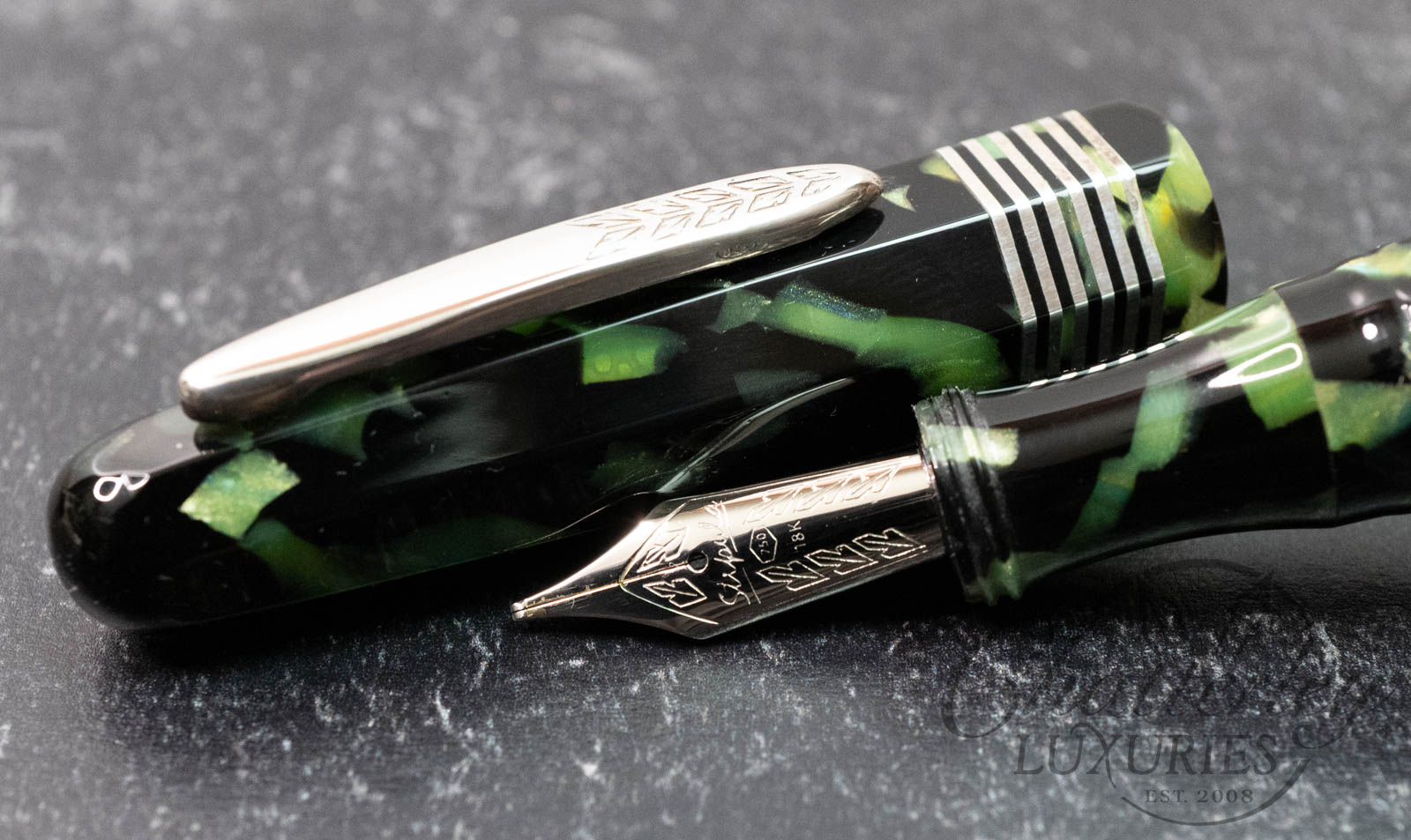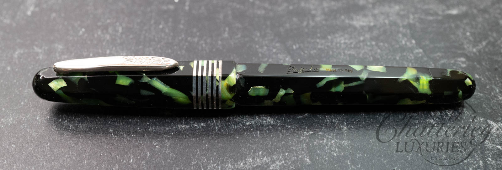 Stipula Etruria Faceted Limited Edition fountain pen is handcrafted by talented and skilled Florentine artisans that utilize the same Renaissance crafting techniques passed down for generations. Featuring a gorgeous, green and black resin material, both the front section and the cap match the barrel material. The unique part of the design is its elegant oval silhouette that is enhanced by the 8-faceted barrel and cap.