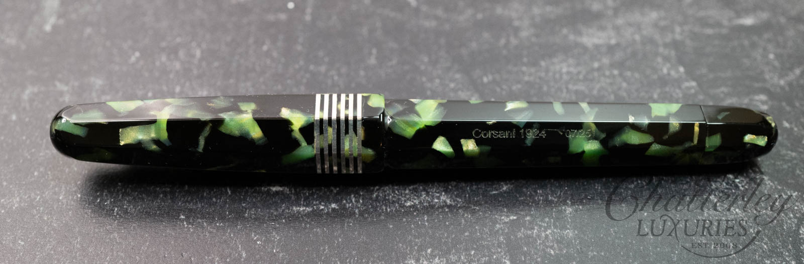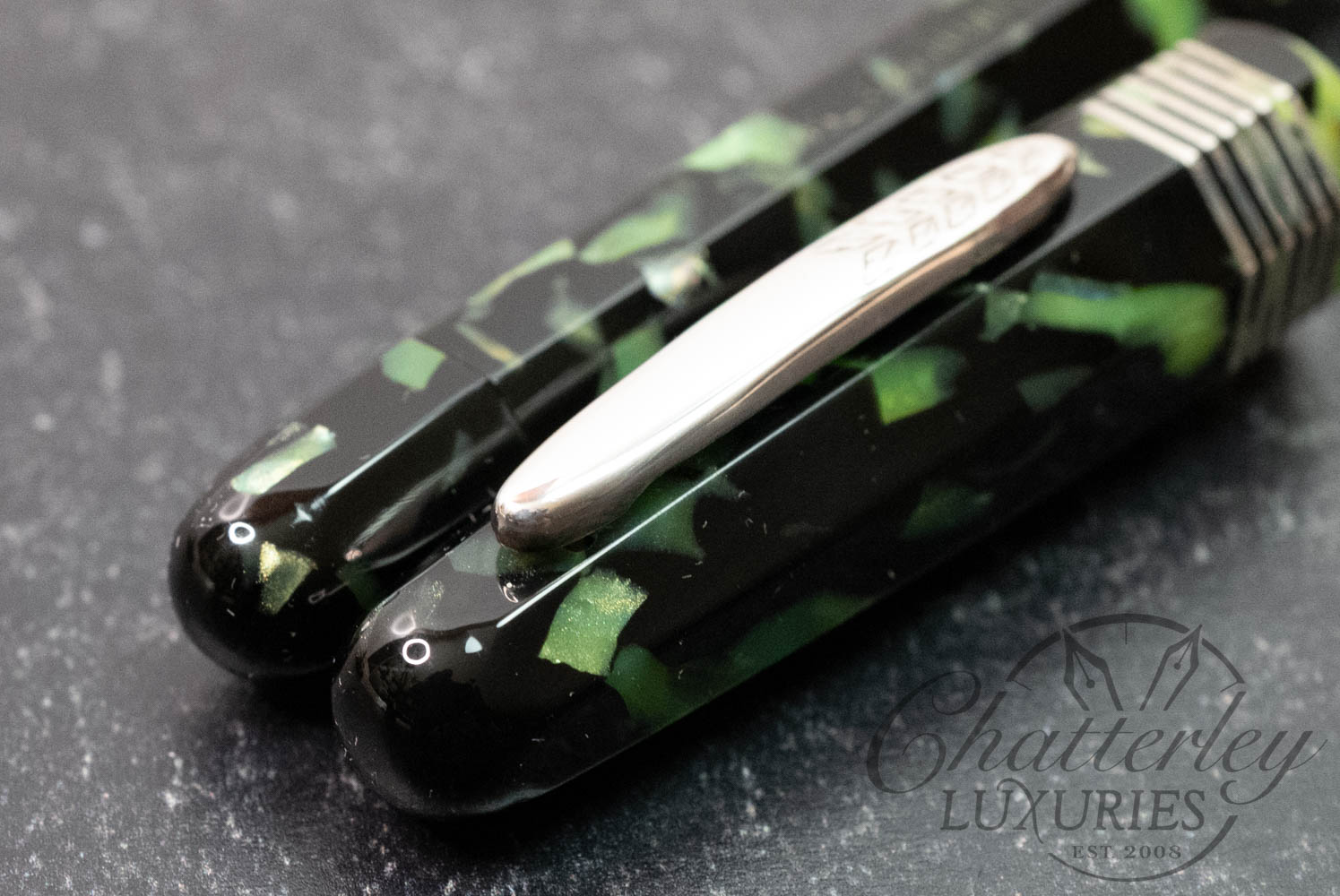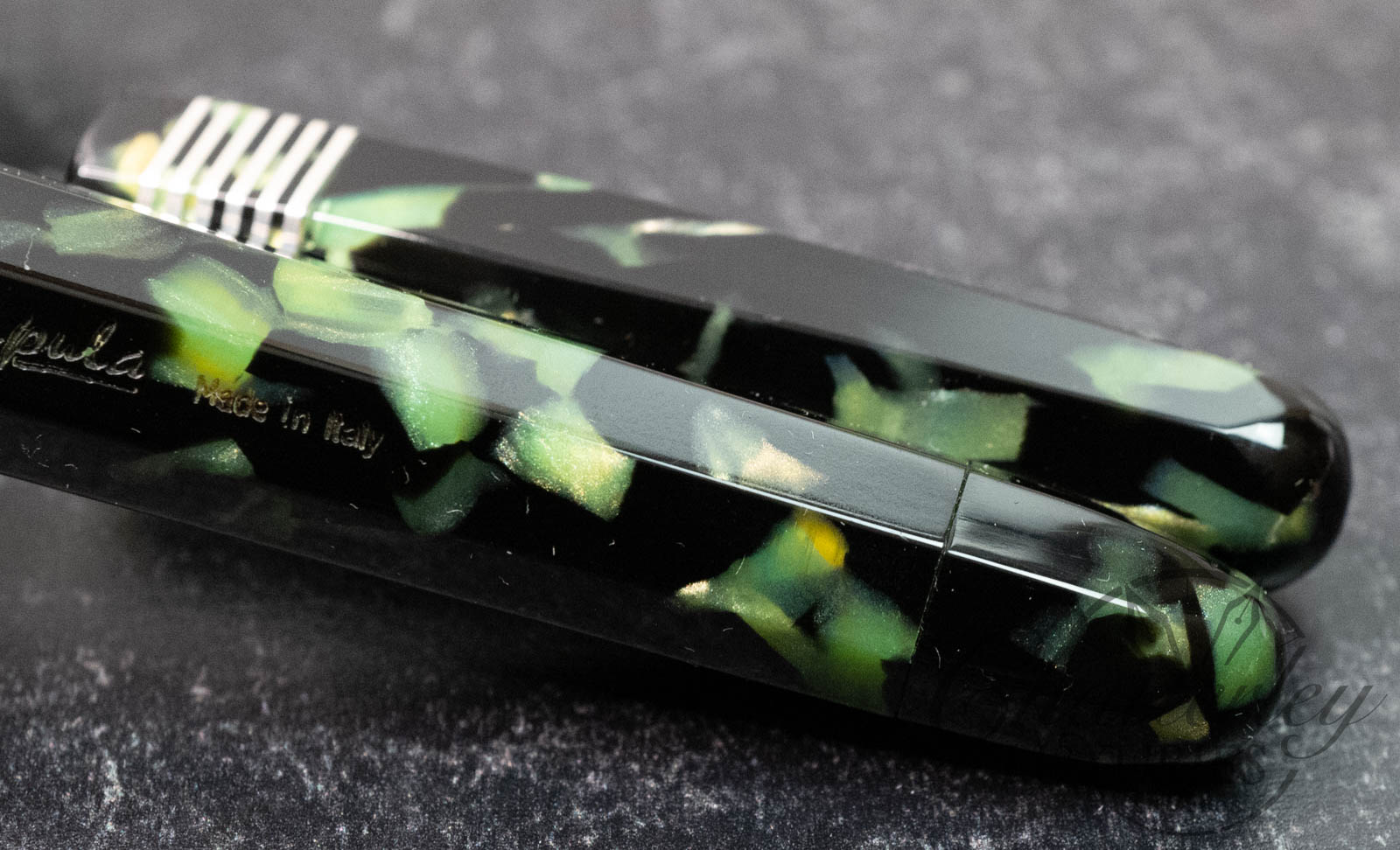 Stipula Etruria Faceted Limited Edition fountain pen is handcrafted by talented and skilled Florentine artisans that utilize the same Renaissance crafting techniques passed down for generations. Featuring a gorgeous, green and black resin material, both the front section and the cap match the barrel material. The unique part of the design is its elegant oval silhouette that is enhanced by the 8-faceted barrel and cap.
