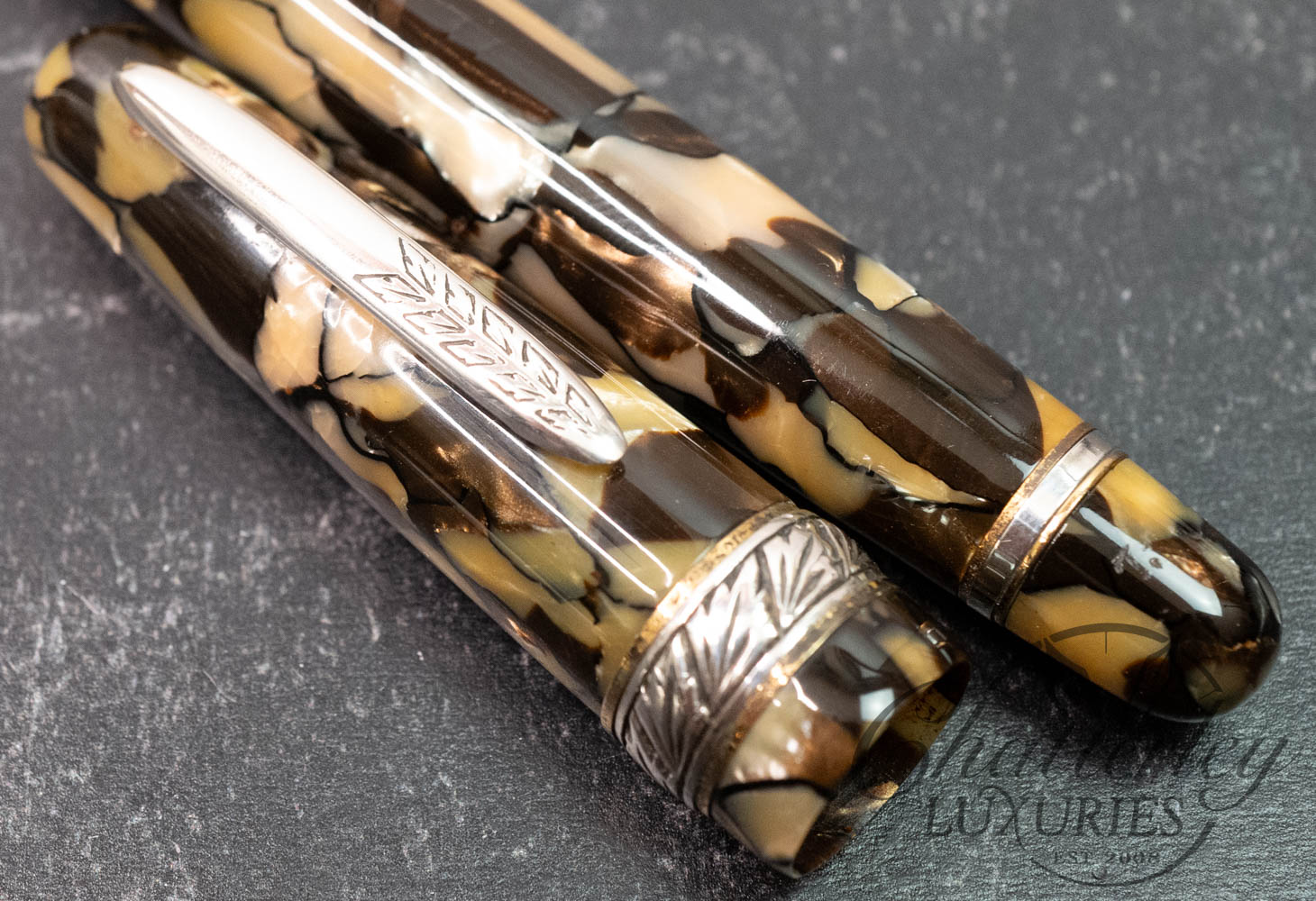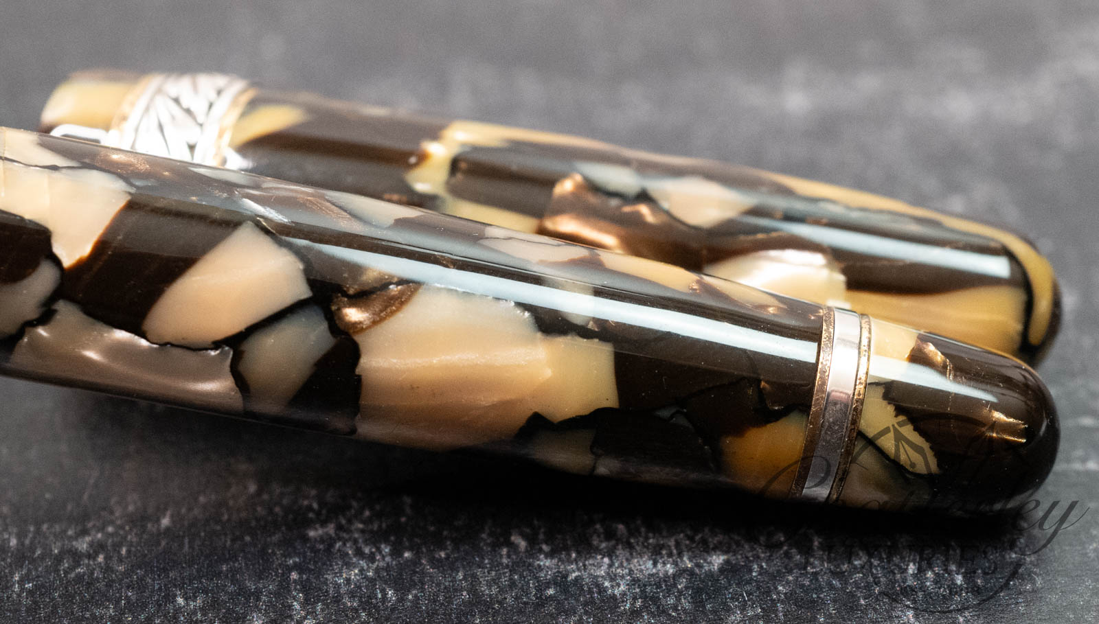 This pen is lovingly used and comes complete with a box and papers. It is equipped with an 18k Medium nib that has been ground to an RNCI (Round Nose Cursive Italic) Broad nib by Matt Chen and fills via a new filling system called “Trivalent”: eyedropper, cartridge and converter. Some tarnishing on the gold trim portions has begun to occur.