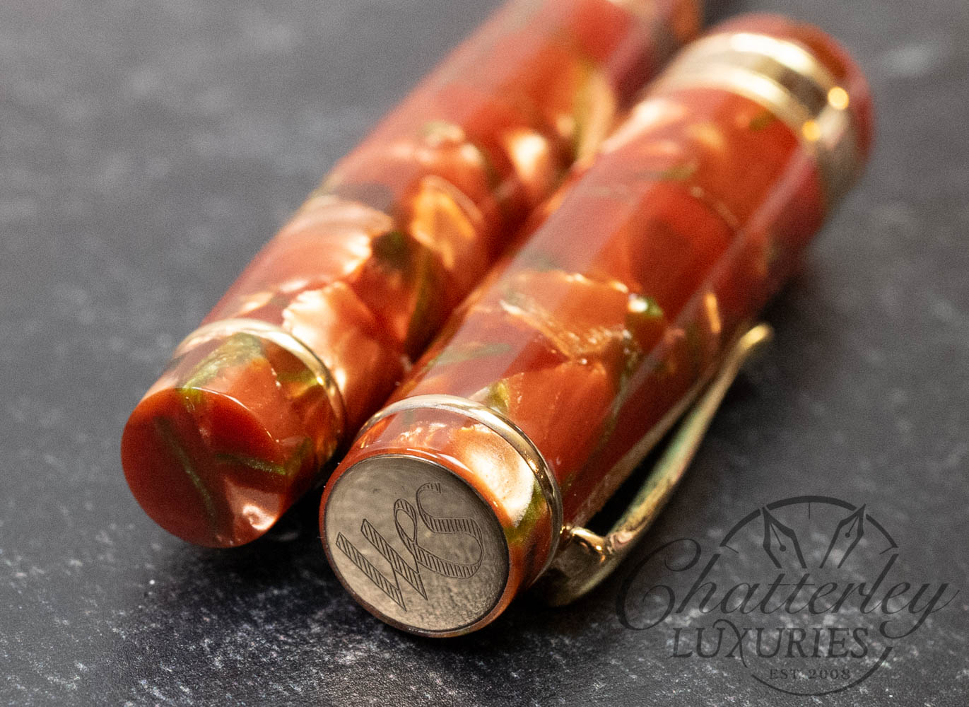 This pen is lovingly used and comes complete with a box and papers. It is equipped with an 18k Broad nib that has been modified to a RNCI (Round Nose Cursive Italic) by Matt Chen and fills via a piston filling system.