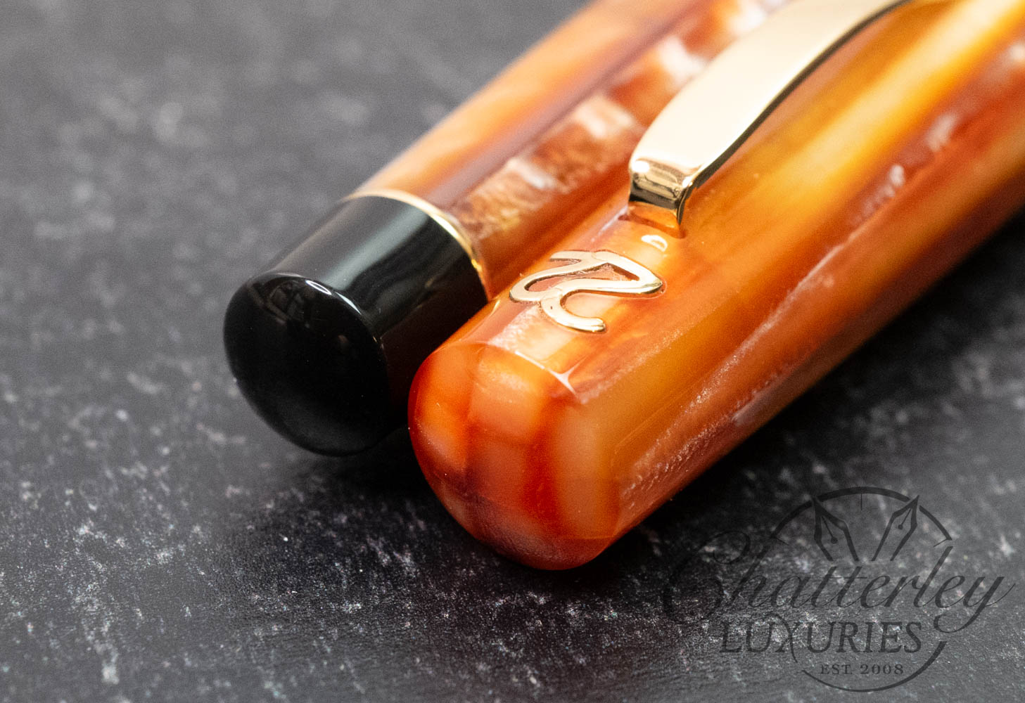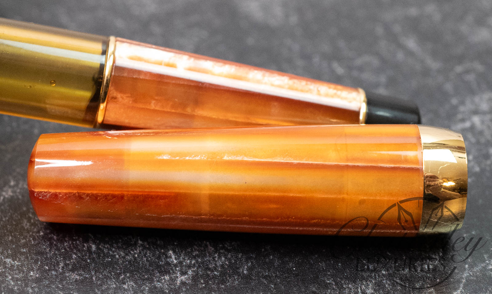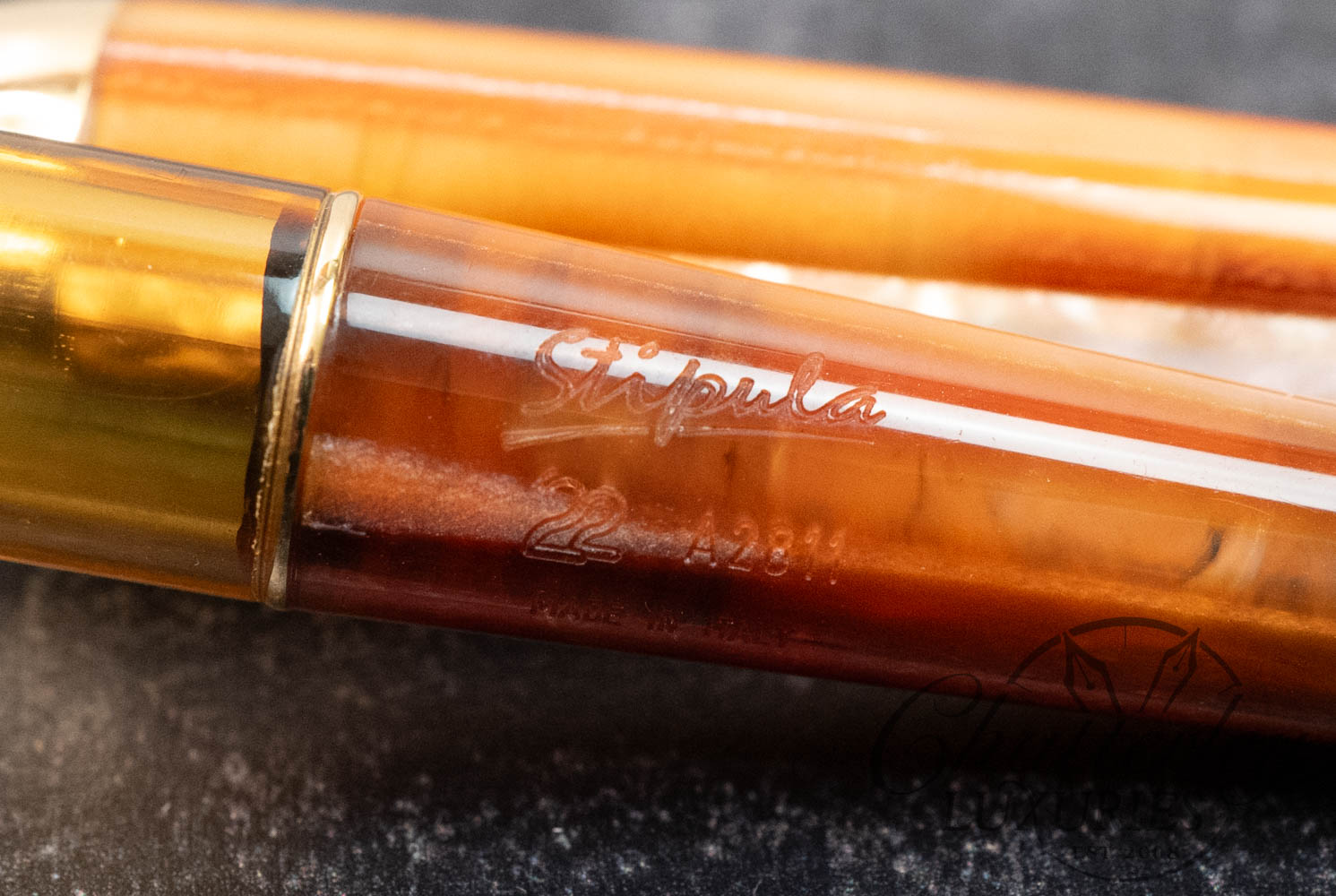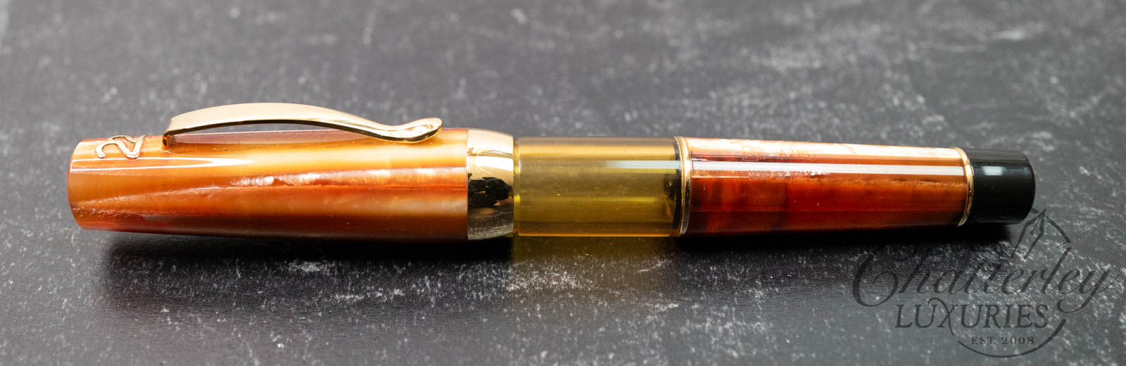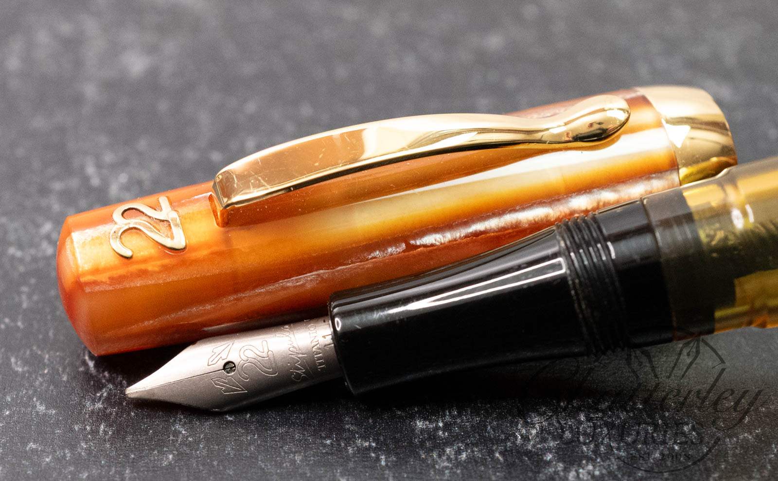 This pen is lovingly used and does not come with a box or papers. It is equipped with a Titanium Stub nib and fills via a Piston Filling system.
