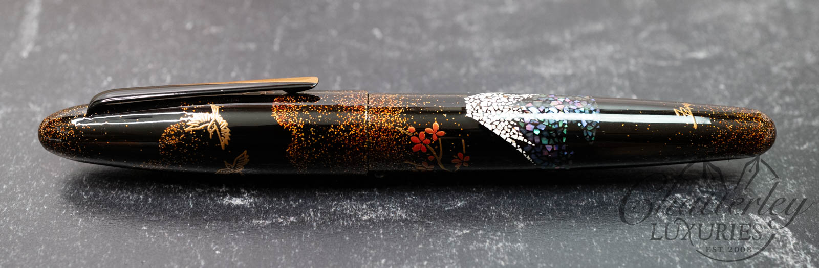 The Fujiyama honors Japan’s most enduring symbol—Mount Fuji—through a remarkable fusion of urushi, raden, and rankaku artistry. Each pen is crafted by hand in Taccia’s Wajima Urushi Studio, where fragments of quail eggshell and abalone shell are meticulously inlaid beneath layers of deep lacquer. The result is a serene landscape rendered in texture and light.