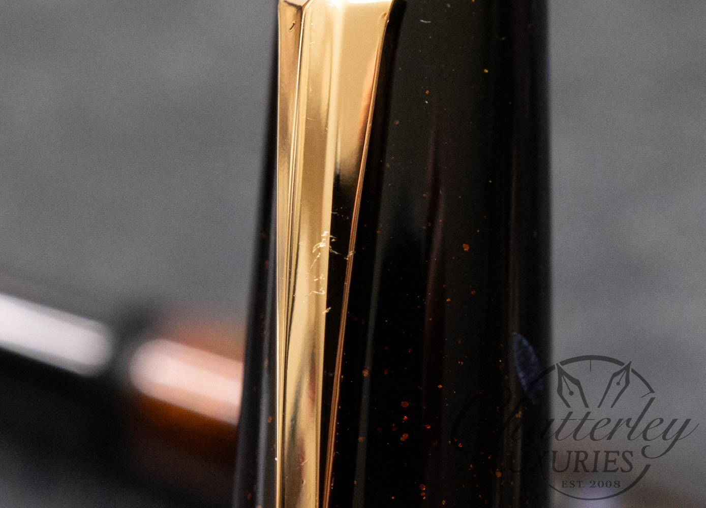 This pen is lovingly used and does not come with a box or papers. It is equipped with a Steel Medium nib and fills via a Cartridge/Convertor (included). There is a minor scratch on the clip (see last image).