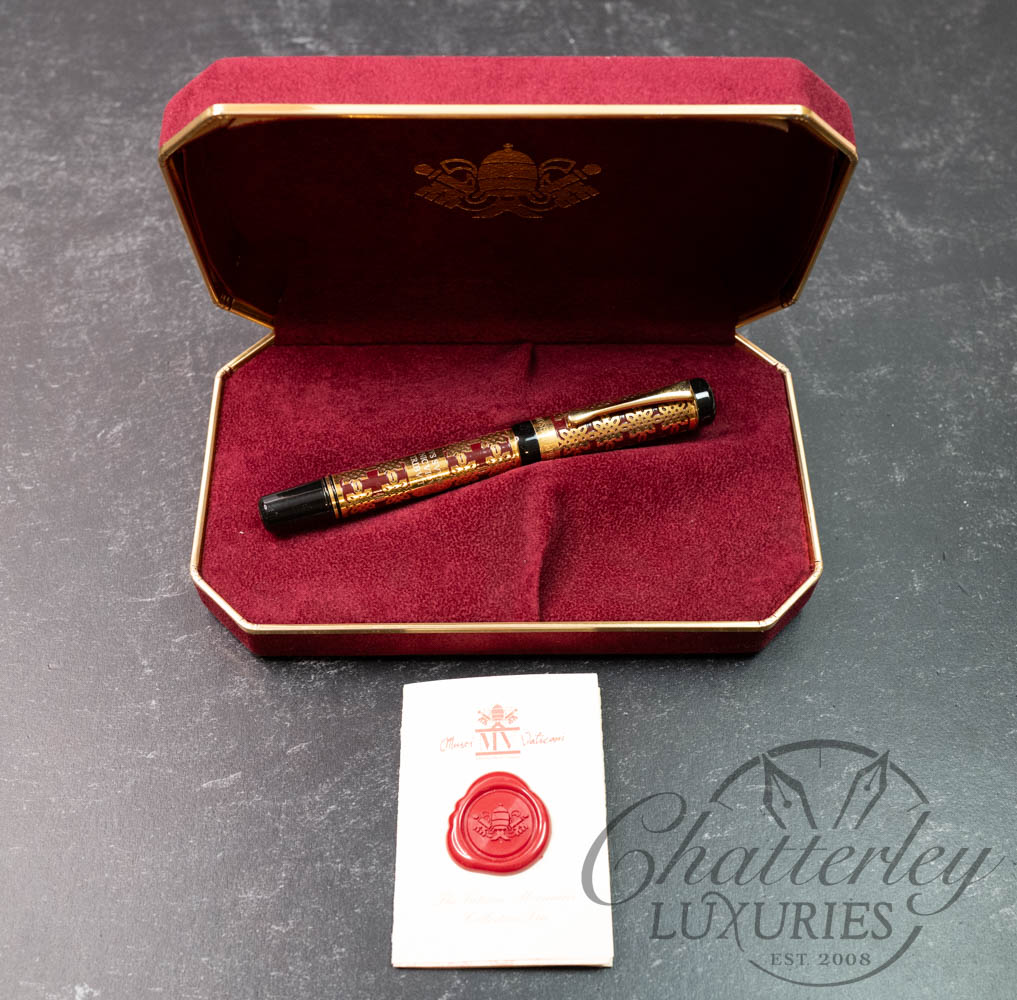 Every aspect of this writing instrument expresses symbolically, a link with the art work housed in the Vatican Museums and the history of the Church of Rome.The gold plated decoration which slightly embraces the shank of the pen, belongs to the Vatican Museums and it is inspired by the majolica designs realized by Luca della Robbia for the ancient floor of the Vatican. The Vatican emblem resides on the cap of the pen.