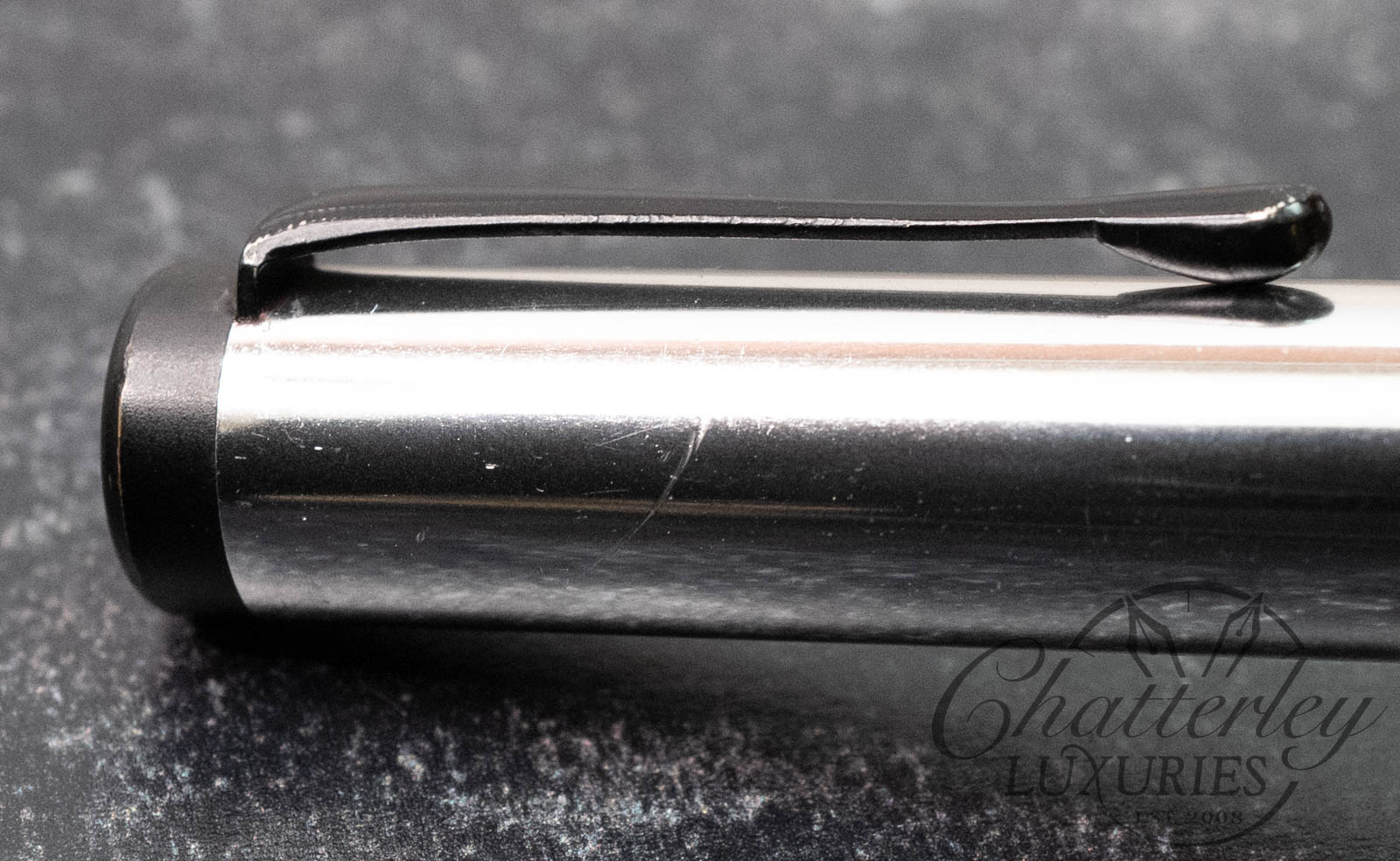 This pen has seen regular use and shows noticeable wear throughout, with clear signs of handling and surface wear in the way of mini surface scratches on the body and clip (see last 2 images). It does not come with a box or papers and is equipped with a Steel Medium nib and fills via a Piston Filling System.