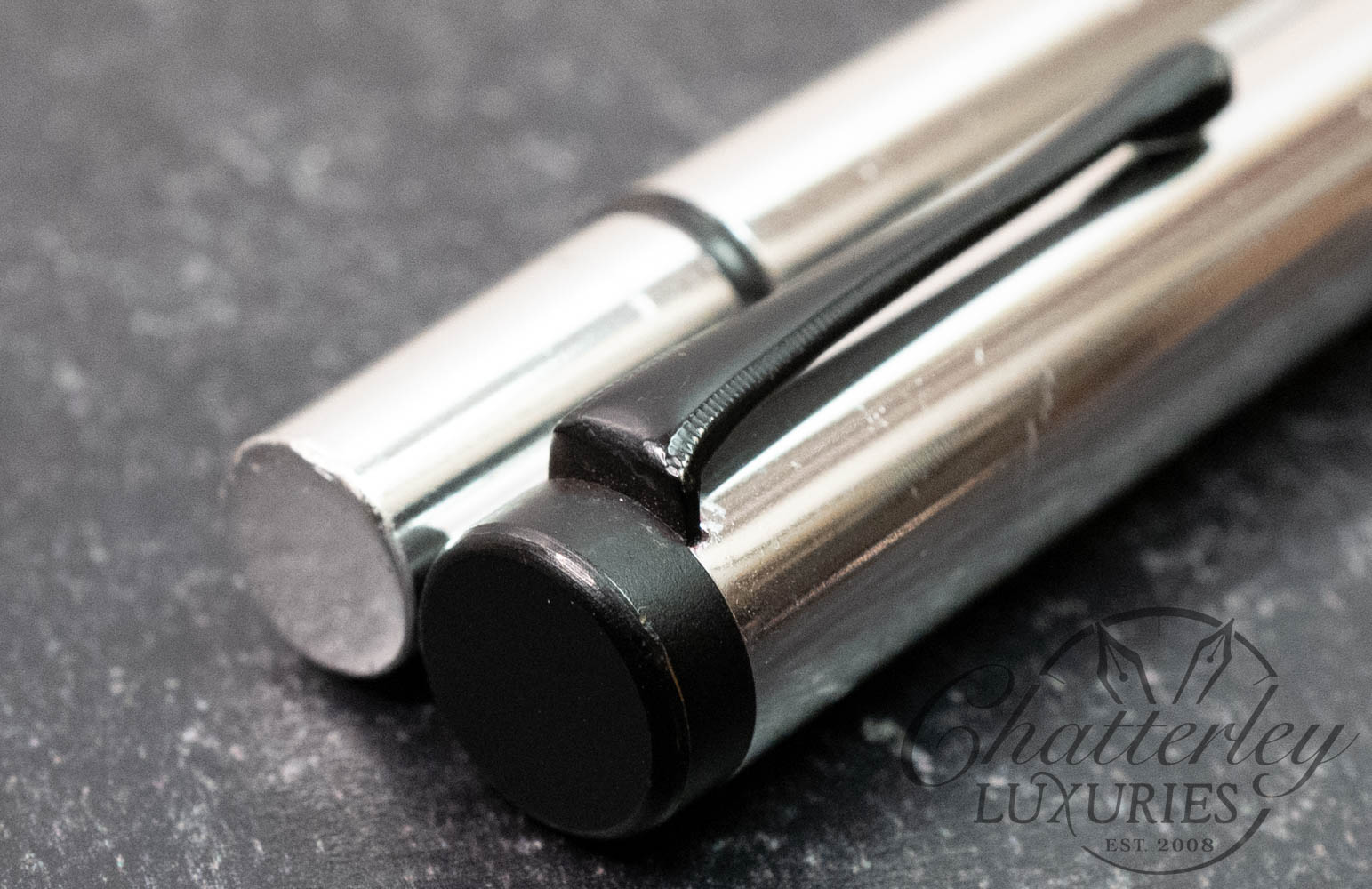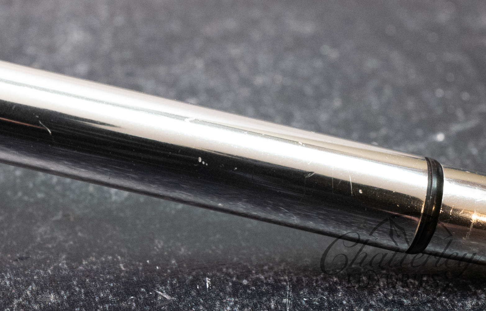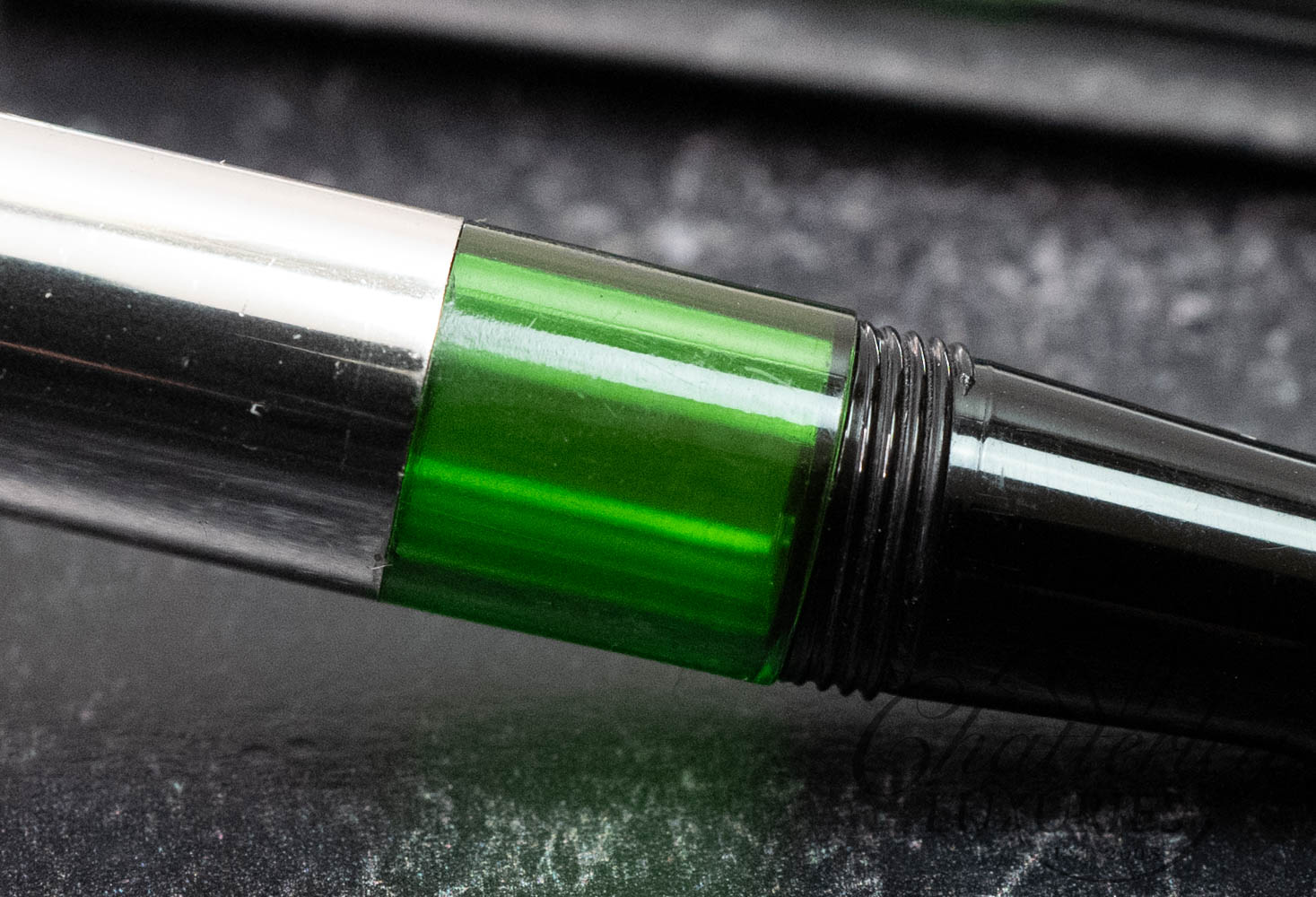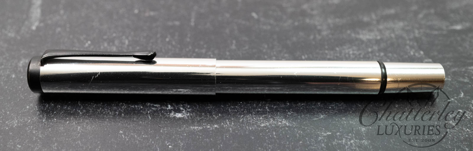 This pen has seen regular use and shows noticeable wear throughout, with clear signs of handling and surface wear in the way of mini surface scratches on the body and clip (see last 2 images). It does not come with a box or papers and is equipped with a Steel Medium nib and fills via a Piston Filling System.