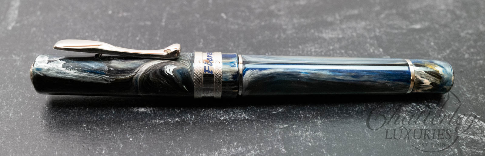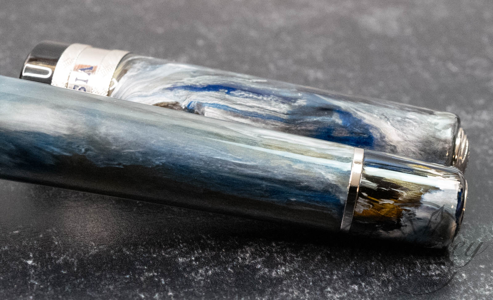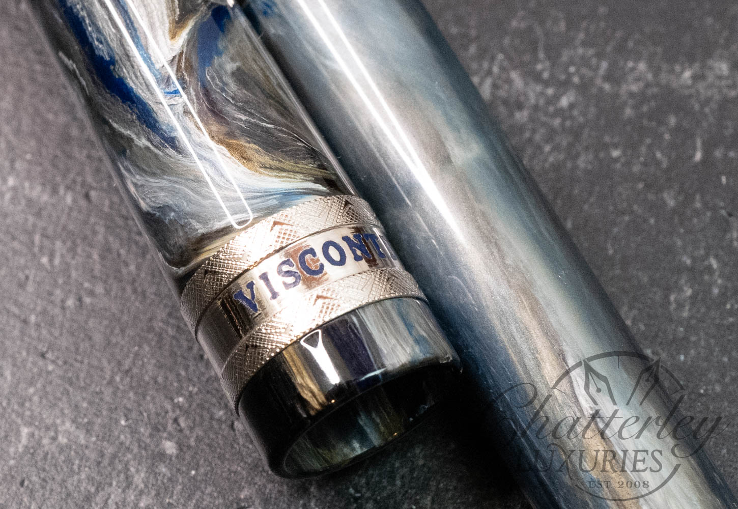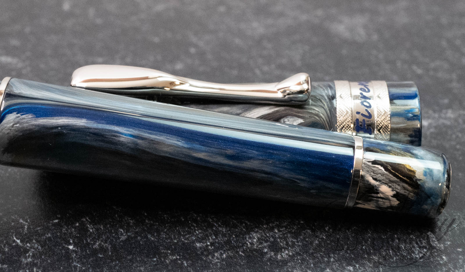 Fiorenza, which translates to old Florence. This pen was produced by Visconti as a special tribute to the medieval city of Florence, Italy, and its important place in the Renaissance, a period of intense innovation in the sciences and arts. This pen is made of Visconti’s proprietary basaltic volcanic lava polymer, the constituent basaltic material having been sourced from Mt Etna, one of Italy’s active volcanoes. The material is extremely durable and hygroscopic, in an elegant grey-blue-black-silver-honey-brown coloration. The special coloration represents a world first in enhancing the volcanic lava polymer to a lustrous swirl texture.  Power filler, with the filling mechanism accessible inside the barrel.