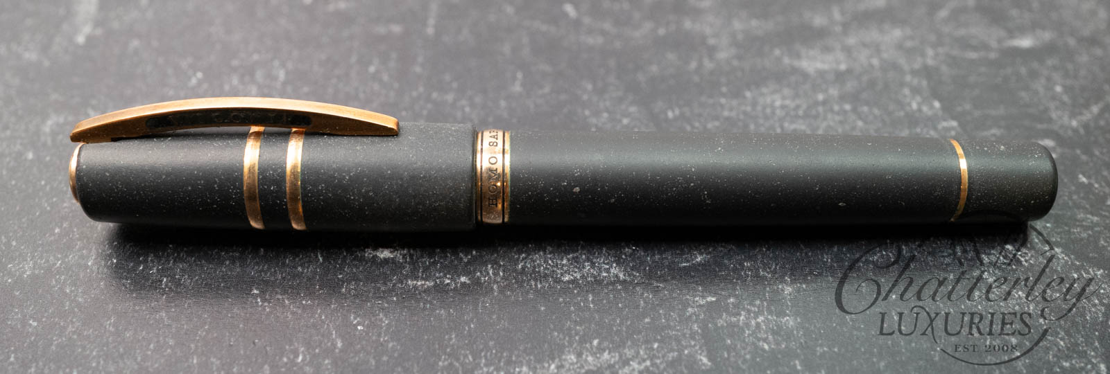 This pen is lovingly used and comes complete with a box and papers. It is equipped with a 18k Broad nib that has been ground to an RNCI (Round Nose Cursive Italic) by Masuyama and fills via a Power Filling system.