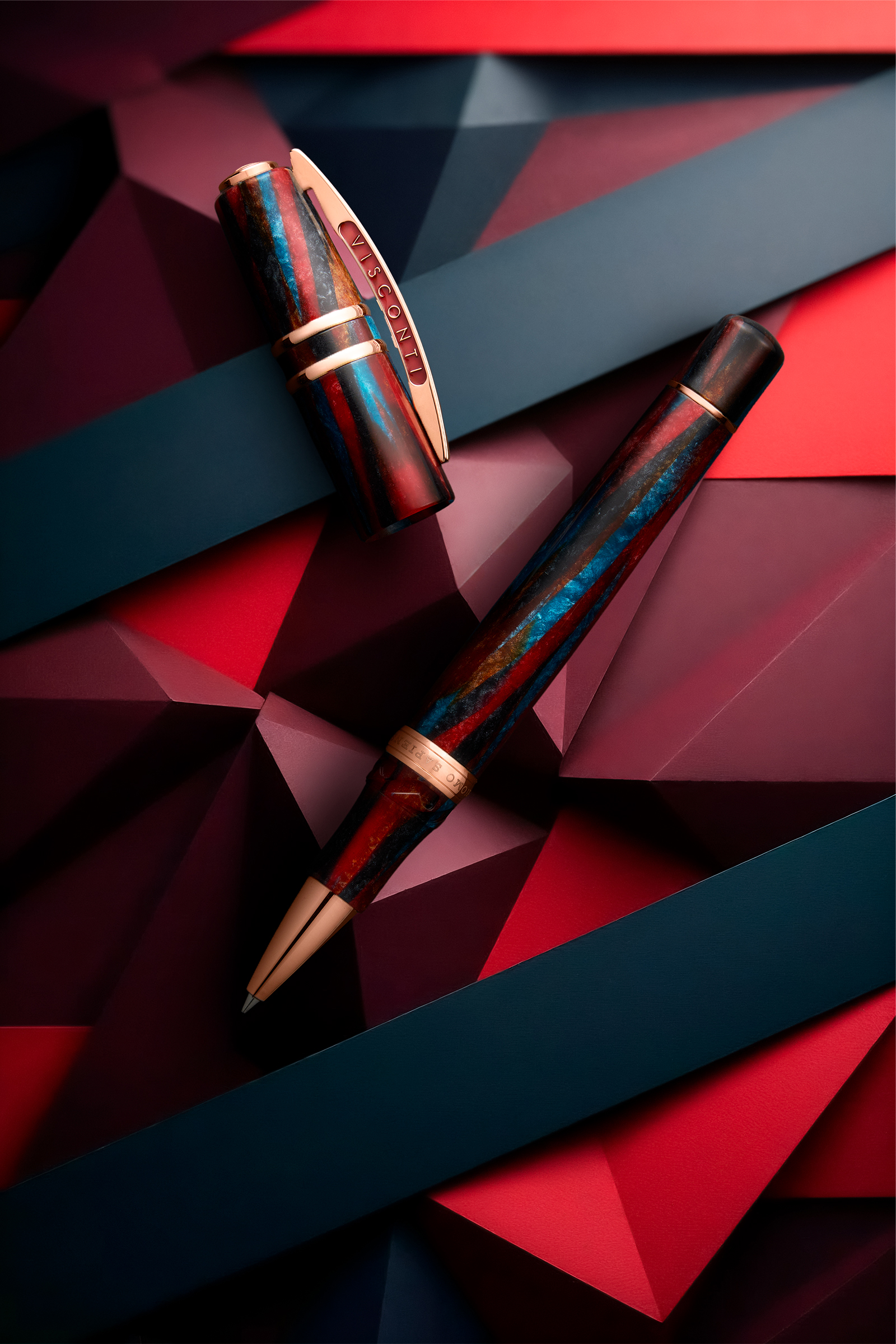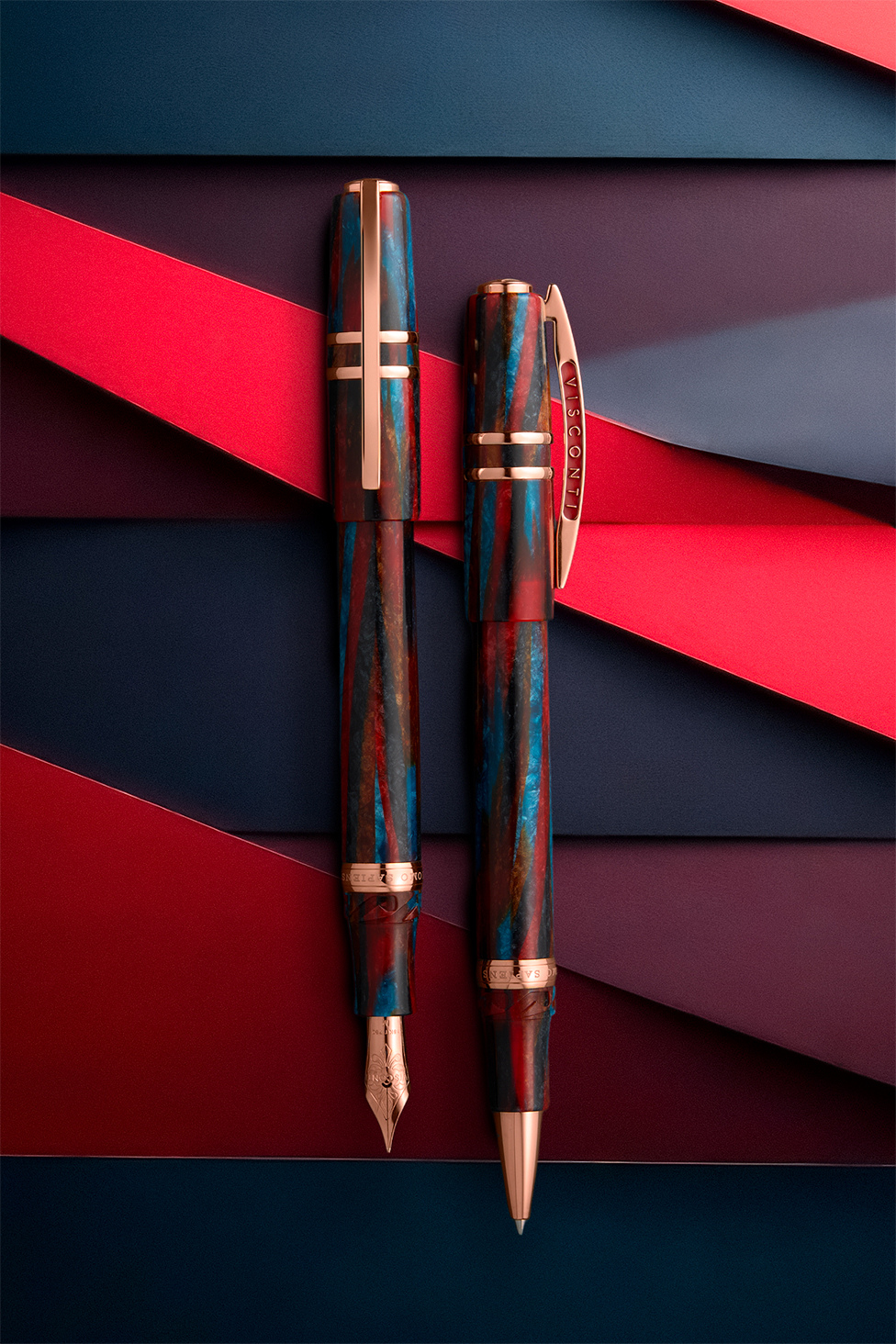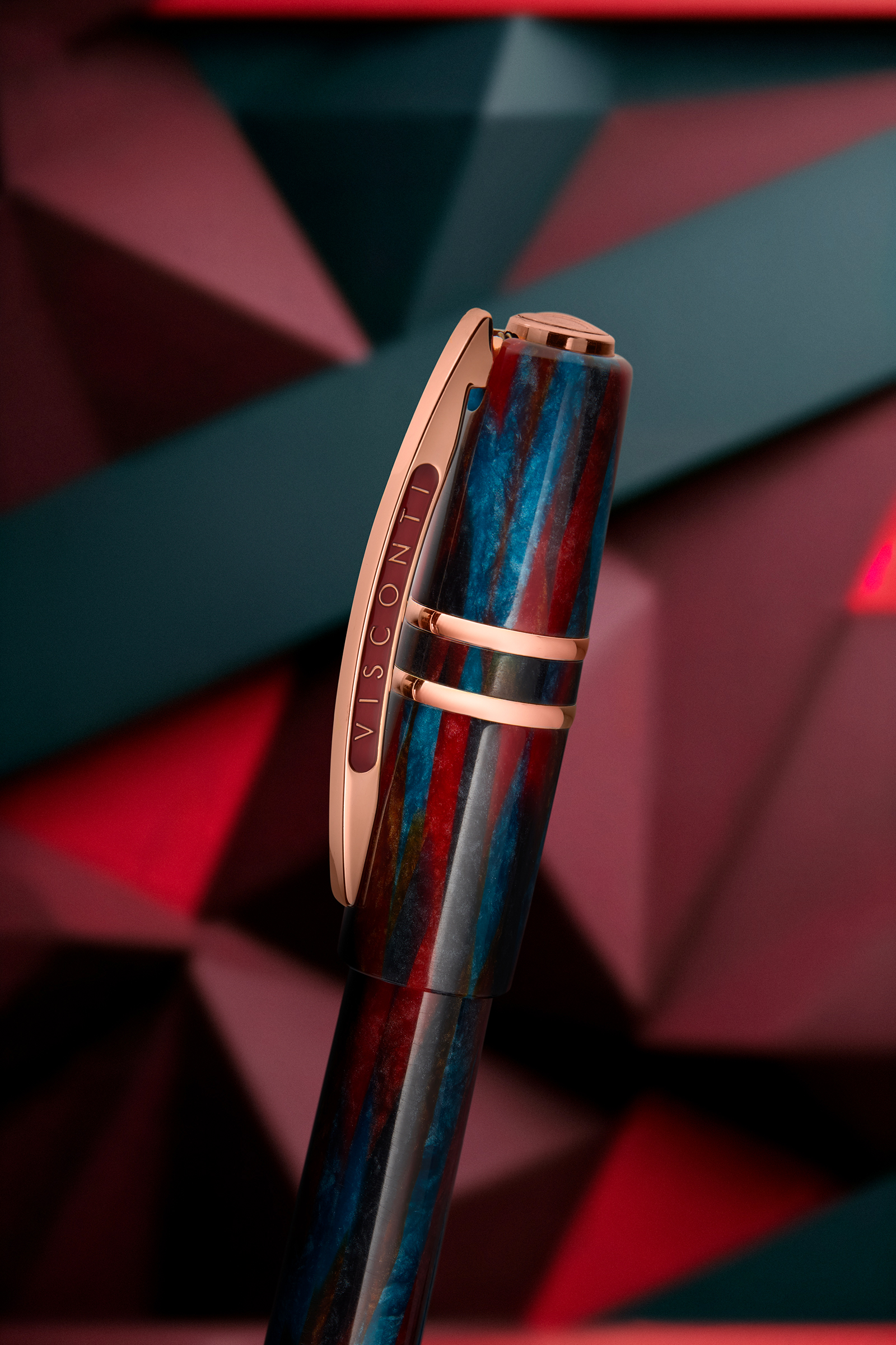 With the Legacy Celluloid, Visconti brings that historic material to one of its most recognizable models. The result is a pen that feels both rooted in tradition and unmistakably Visconti. The striped celluloid pattern gives the pen movement, depth, and a beautiful play of light across the body, while the rose gold trim adds warmth and contrast. The enameled clip is a refined finishing detail that helps set the piece apart.