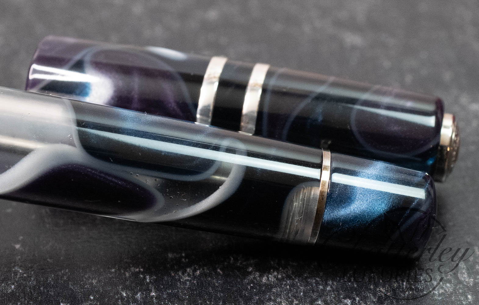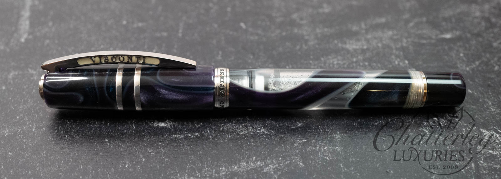 This pen is lovingly used and does not come with a box or papers. It is equipped with a 23k Palladium Medium nib that has been grounded to a Cursive Smooth Italic Mark Bacas. It fills via Visconti’s Double Reservoir Power Filler.