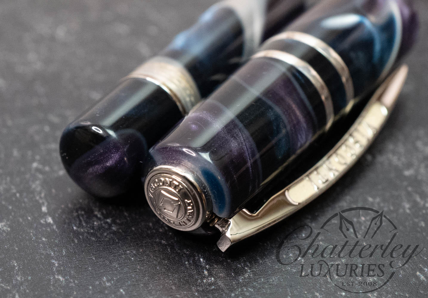 The Visconti team has worked hard to replicate these beautiful colors in a new unique resin palette throughout the pens body and cap. The barrel of the pen features ribbons and swirls of shaved acryloid, suspended in a clear acrylic resin while the cap and plunger feature the same colors fixed into in a marbleized navy blue resin. All trims are crafted in 925 sterling silver. The Midnight in Florence is truly a spectacular pen.