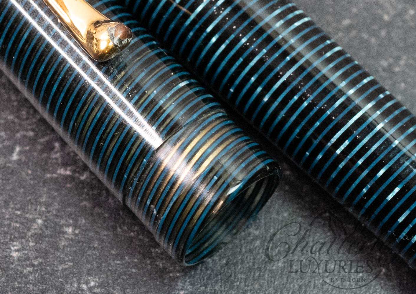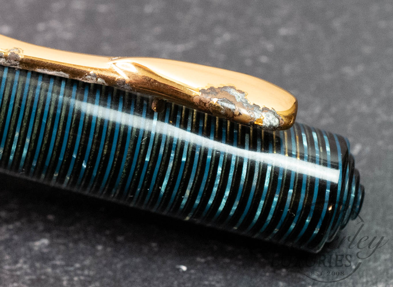 This pen has seen regular use and shows noticeable wear throughout, with clear signs of handling and surface wear in the way of plating on the clip is beginning to deteriorate and the cap is missing the trim ring (see last two images). It is equipped with an 18k Fine nib and fills via a Piston Filling System.