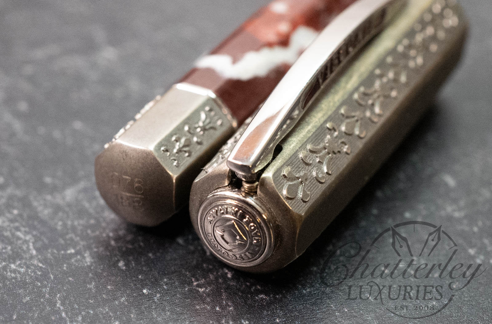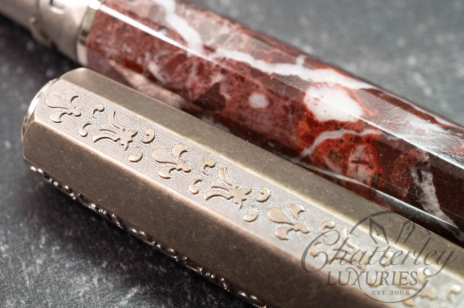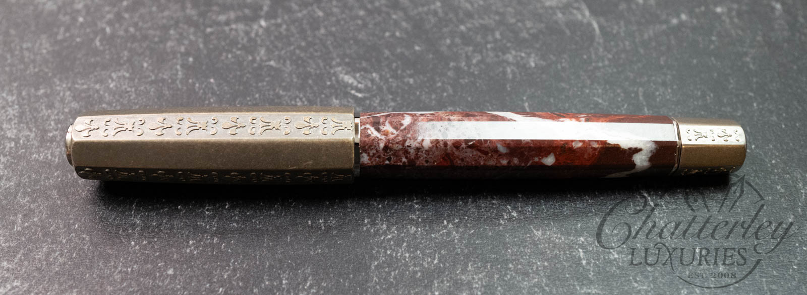 The motifs chiseled on the cap and repeated on the blind cap are lilies, symbols of Florence. The top of the cap is enriched with the ancient coat of arms of the Medici family with six balls. The body is the central heart of the pen in solid Levanto reddish marble. It is faceted in eight sides like the baptistery in front of the Dome of Florence that was completed during Lorenzo being ruler of Florence. The choice of the marble was in line with the official colors of the Medici family that can be found in Palazzo Medici Ricciardi official residence of Lorenzo il Magnifico. It comes together with the famous double reservoir filling system and the iconic 23kt palladium nib.