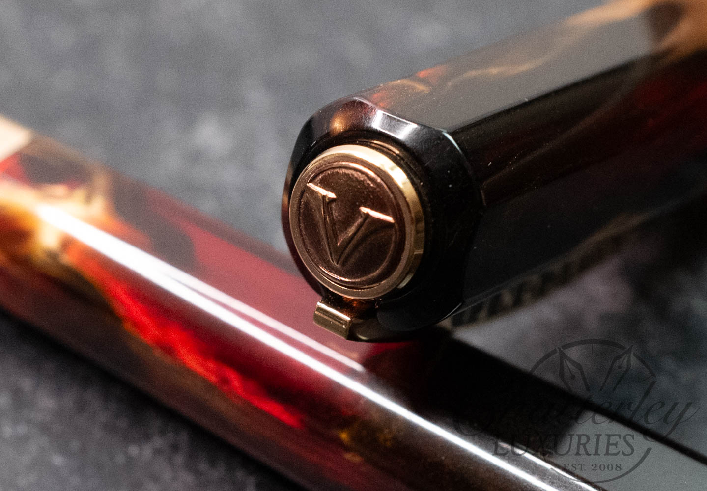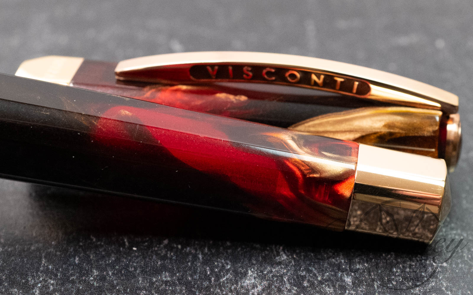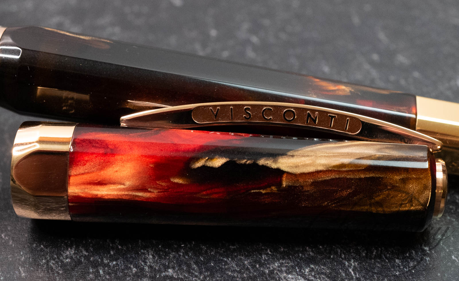 The Opera Master Firestorm is a rich resin, with its deep red and brown hues accented by a golden shimmer and fitted with rose gold trim. The Visconti name on the Ponte Vecchio clip is filled with a subtle sparkly amber enamel, accenting the resin’s warm color palette well.
