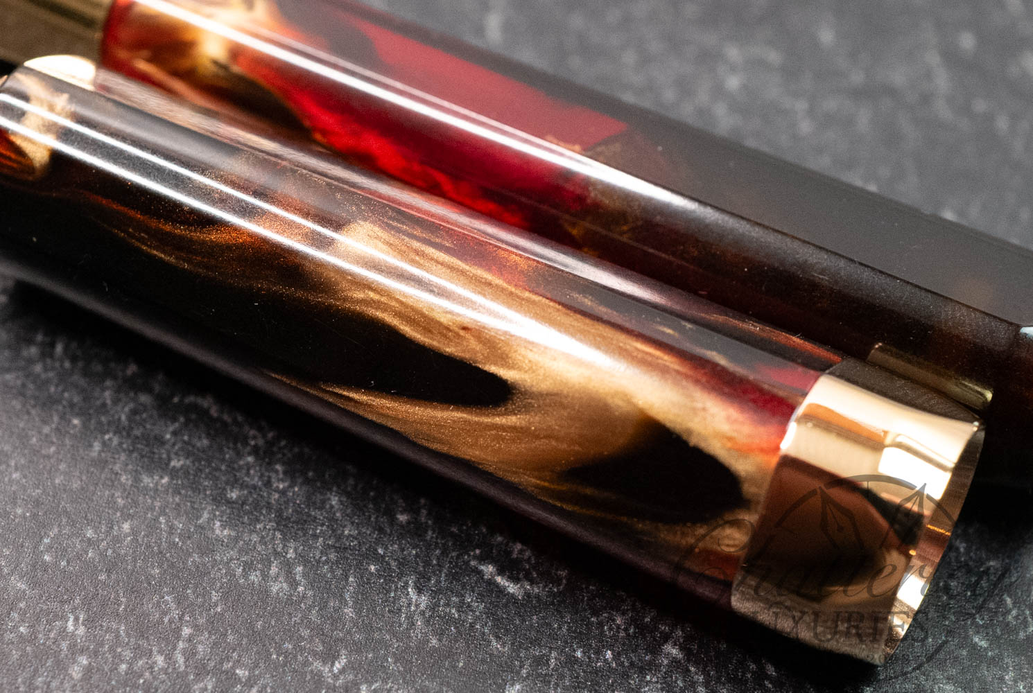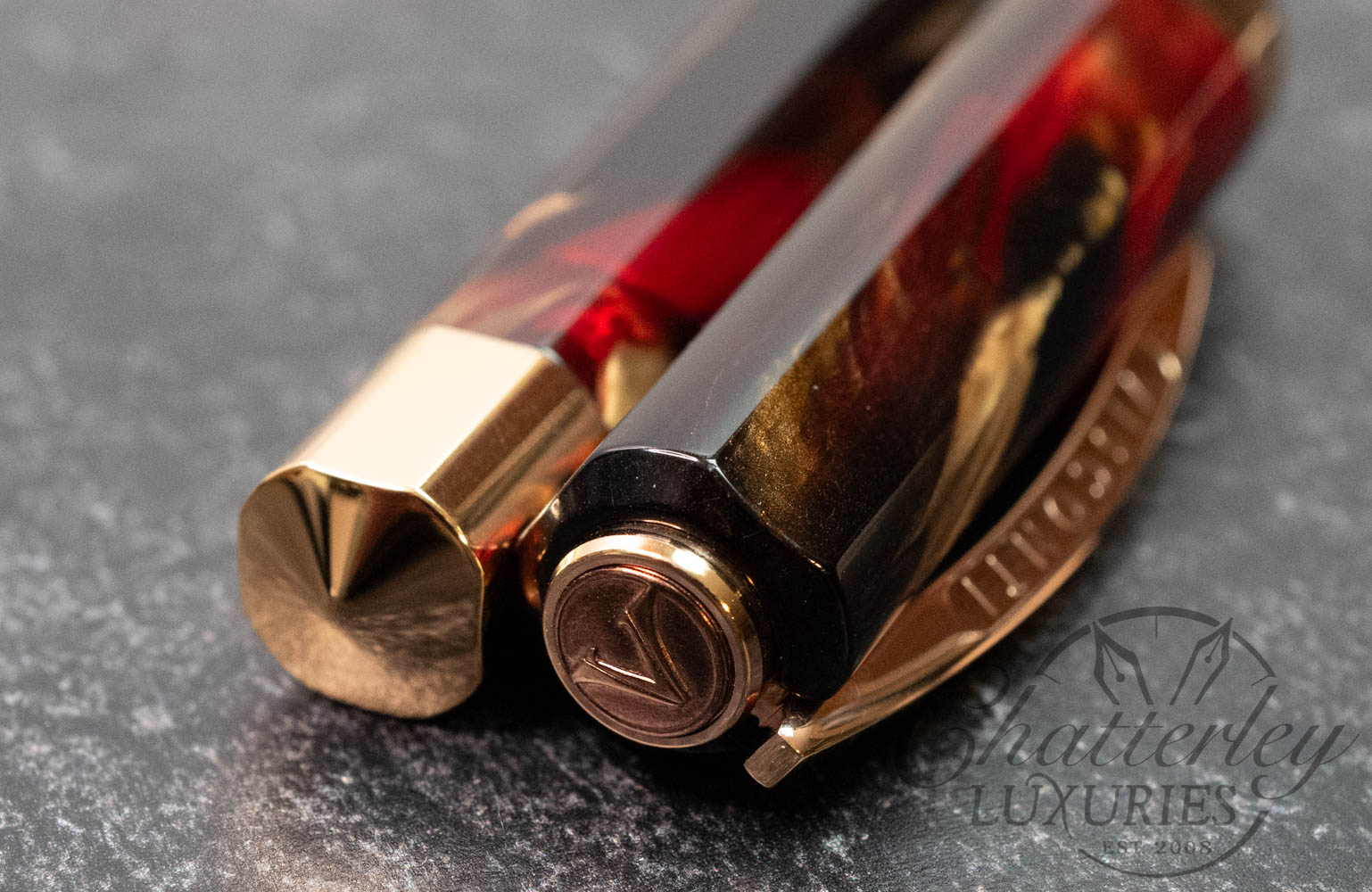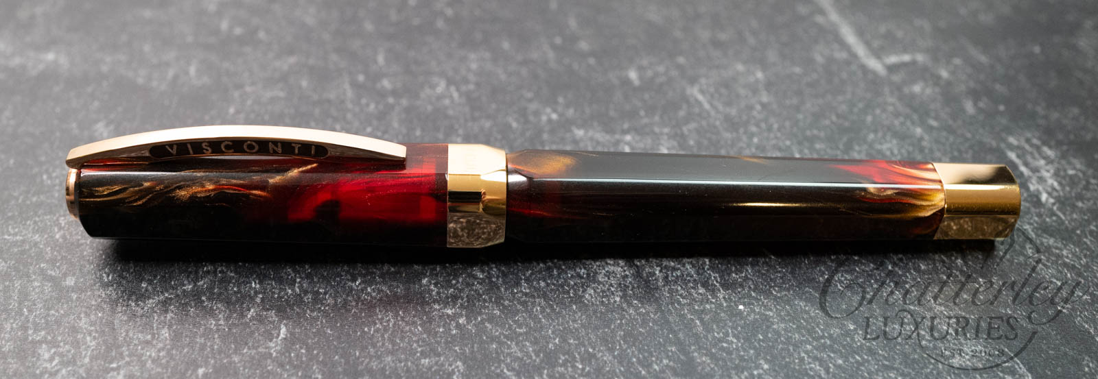 The Opera Master Firestorm is a rich resin, with its deep red and brown hues accented by a golden shimmer and fitted with rose gold trim. The Visconti name on the Ponte Vecchio clip is filled with a subtle sparkly amber enamel, accenting the resin’s warm color palette well.