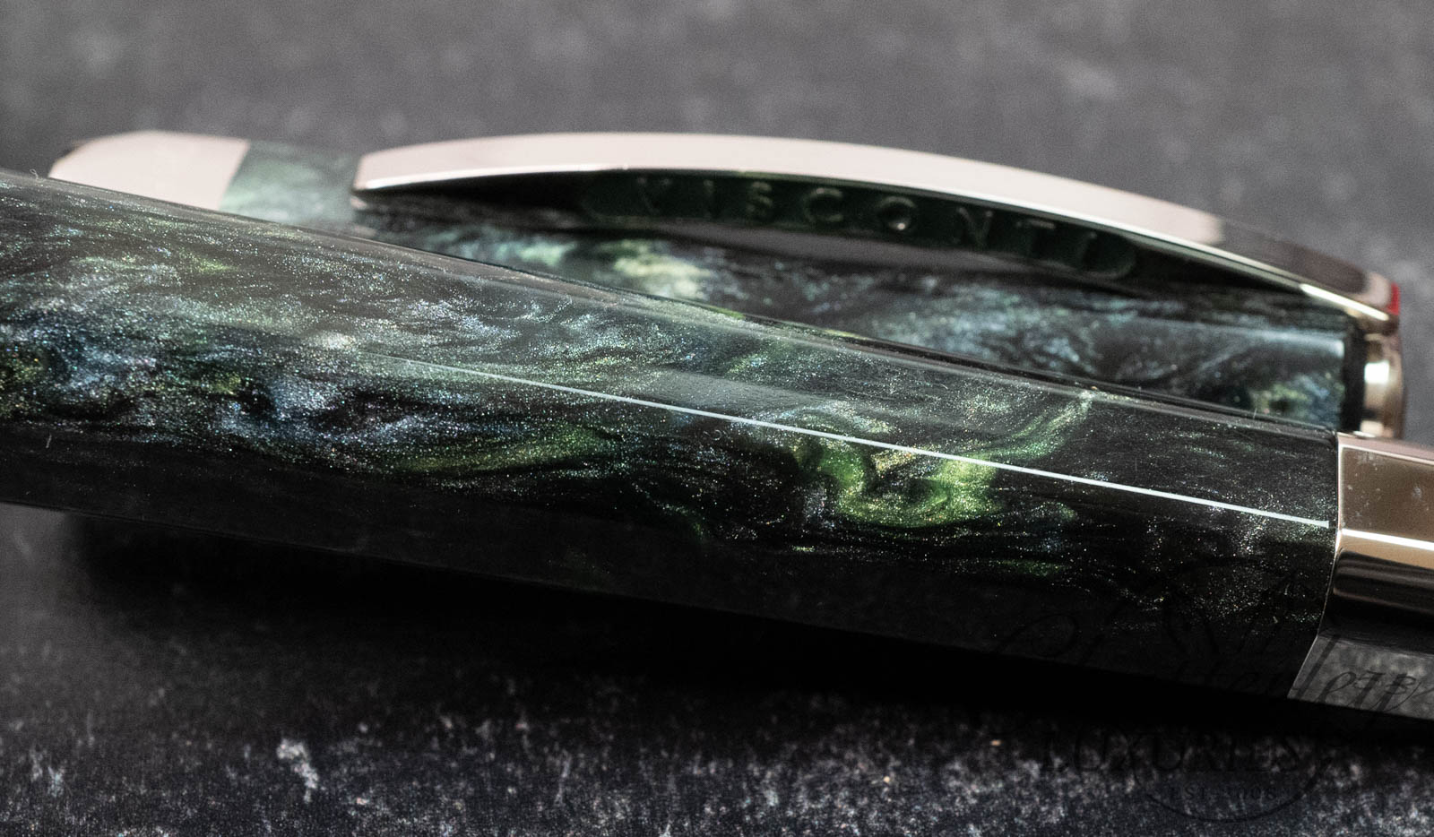 This pen is lovingly used and does not come with a box or papers. It is equipped with an 18k Medium nib and fills via Visconti’s Double Reservoir Power Filler.