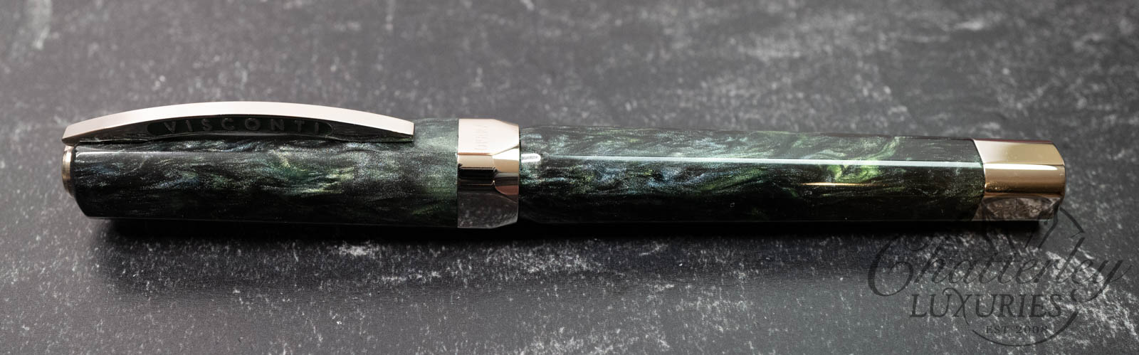 This pen is lovingly used and does not come with a box or papers. It is equipped with an 18k Medium nib and fills via Visconti’s Double Reservoir Power Filler.