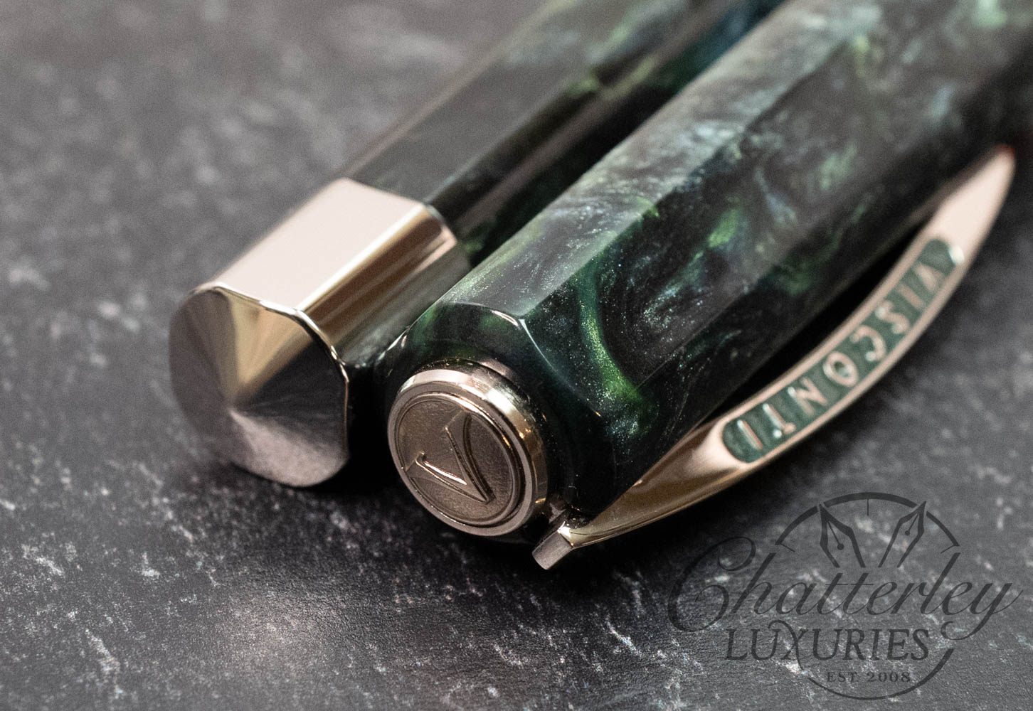 The Opera Master Stargazer is a glimmering resin that evokes a sense of otherworldliness, with its various blue hues, and vibrant green colors trimmed in palladium. The Visconti name on the Ponte Vecchio clip is accented by a sparkling teal enamel, perfectly complimenting the resin’s cool color palette.