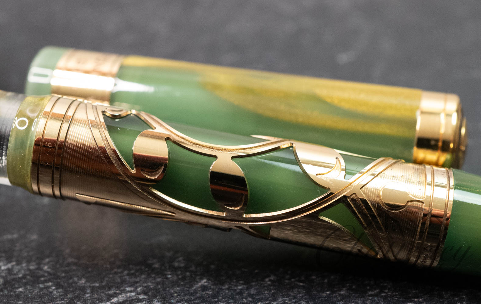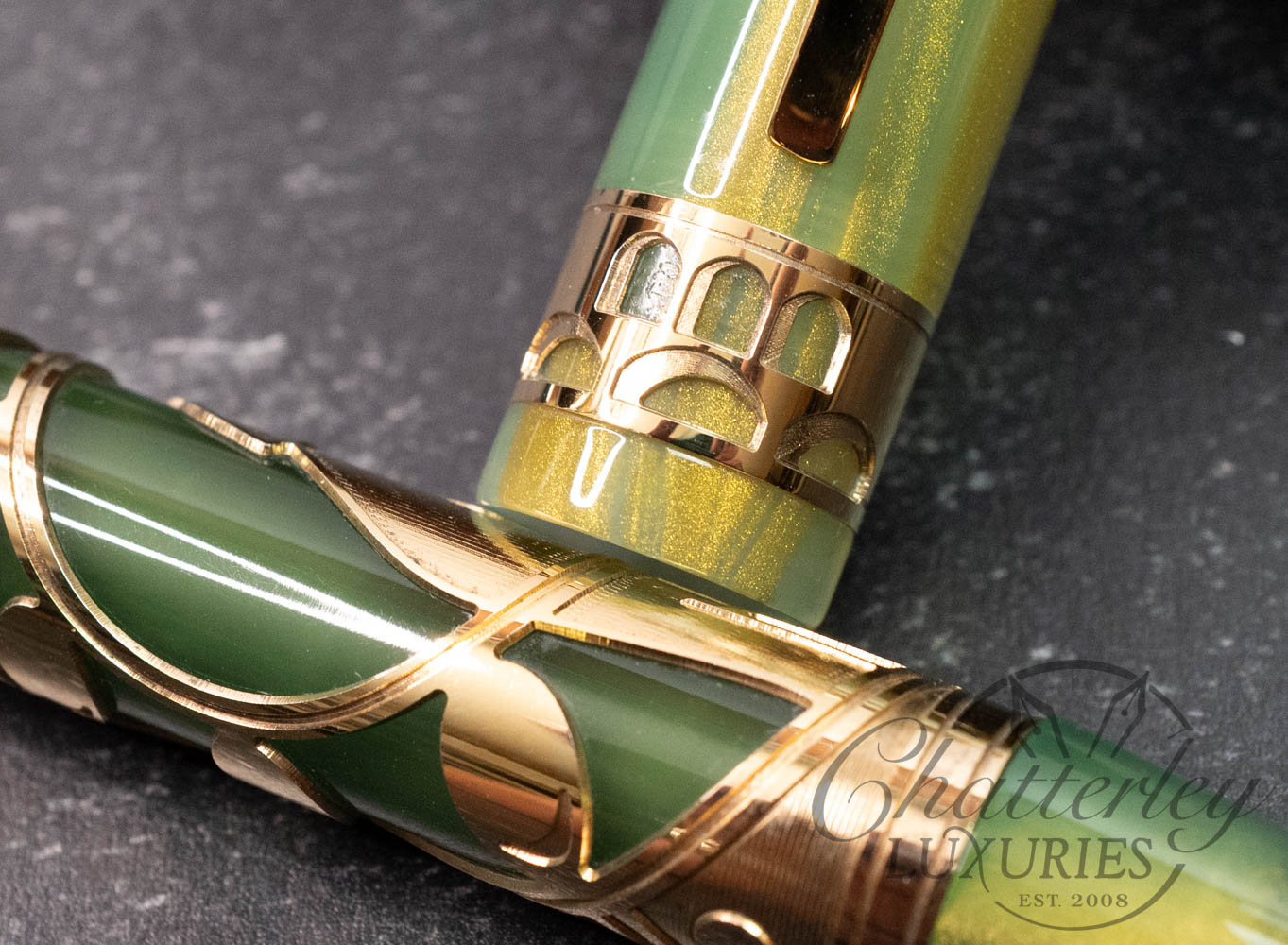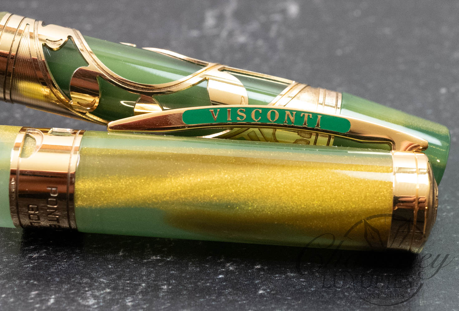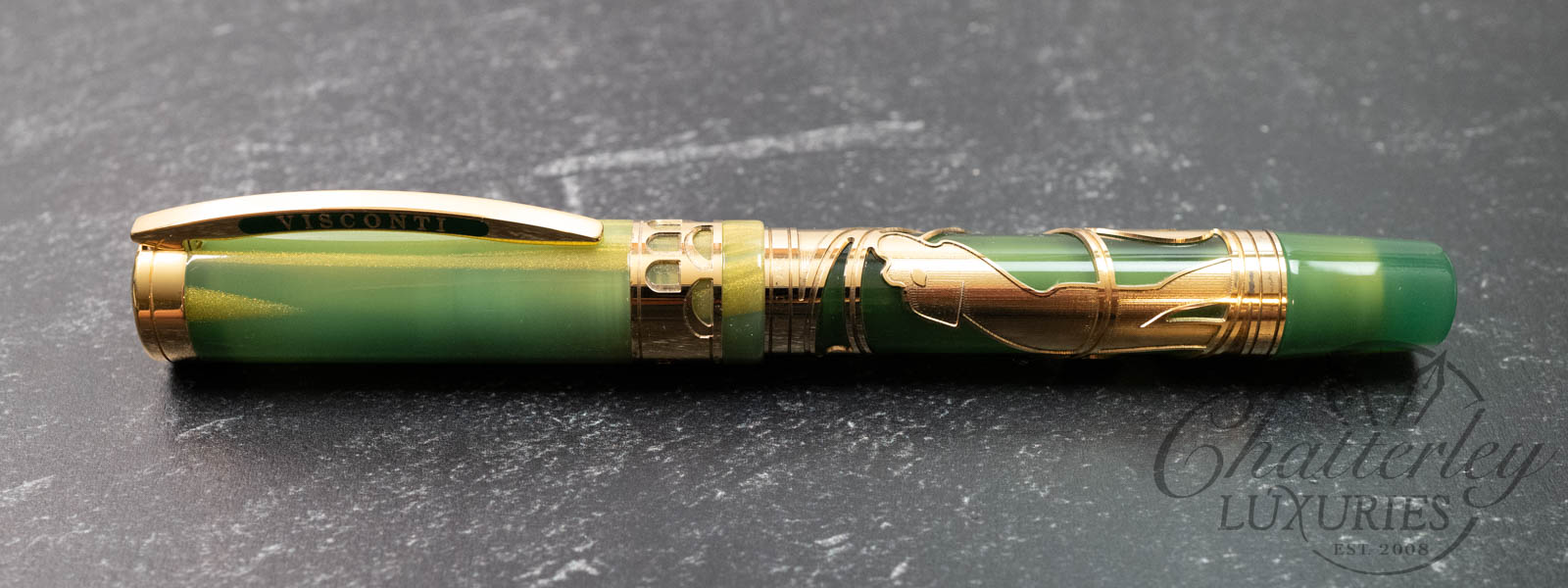This limited edition pen is available with vermeil trim. The pen is made of green resin with gold dust and stands out for the same elegance, culture and vision of design that unites the Renaissance city, the art of writing and the sport of golf. But golf is the star of this pen, which sports a perforated relief engraving of a golfer’s swing. On the cap band is an image of an arch from Florence’s most famous bridge and the name of the pen. Visconti’s hallmark arch-shaped clip stands out on the cap.