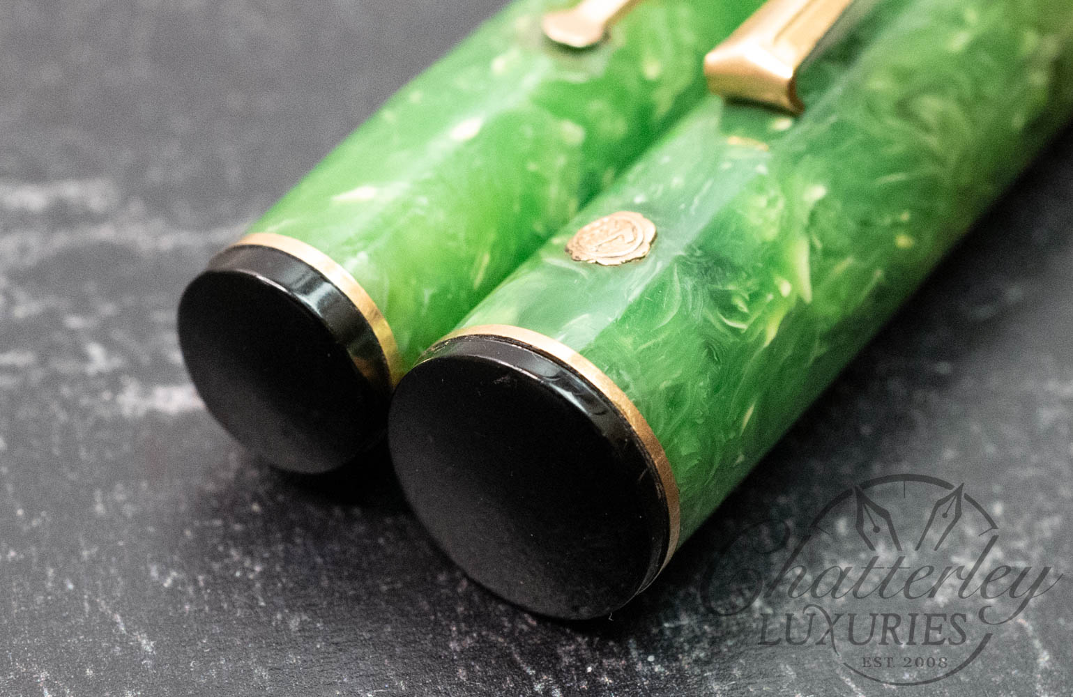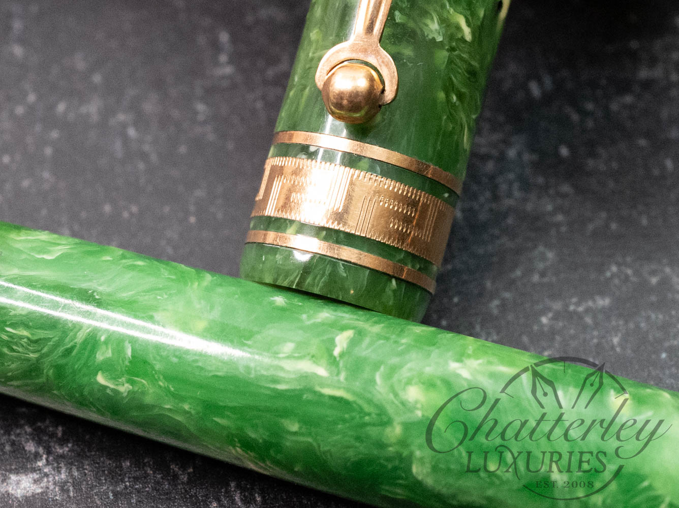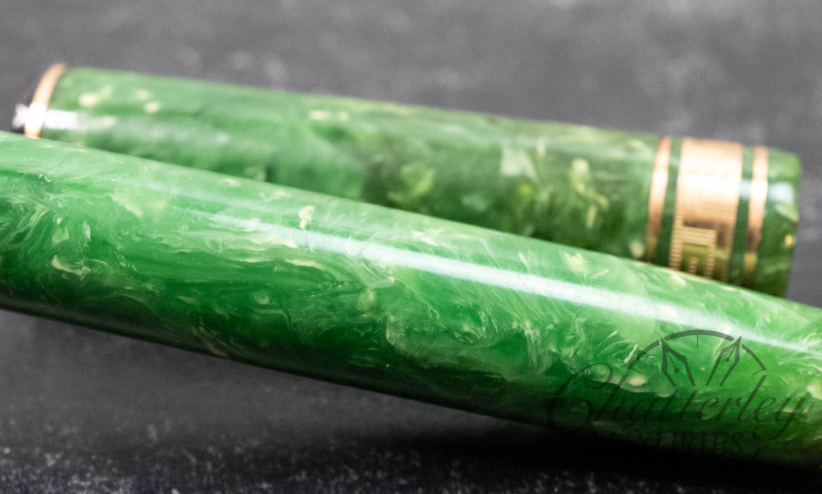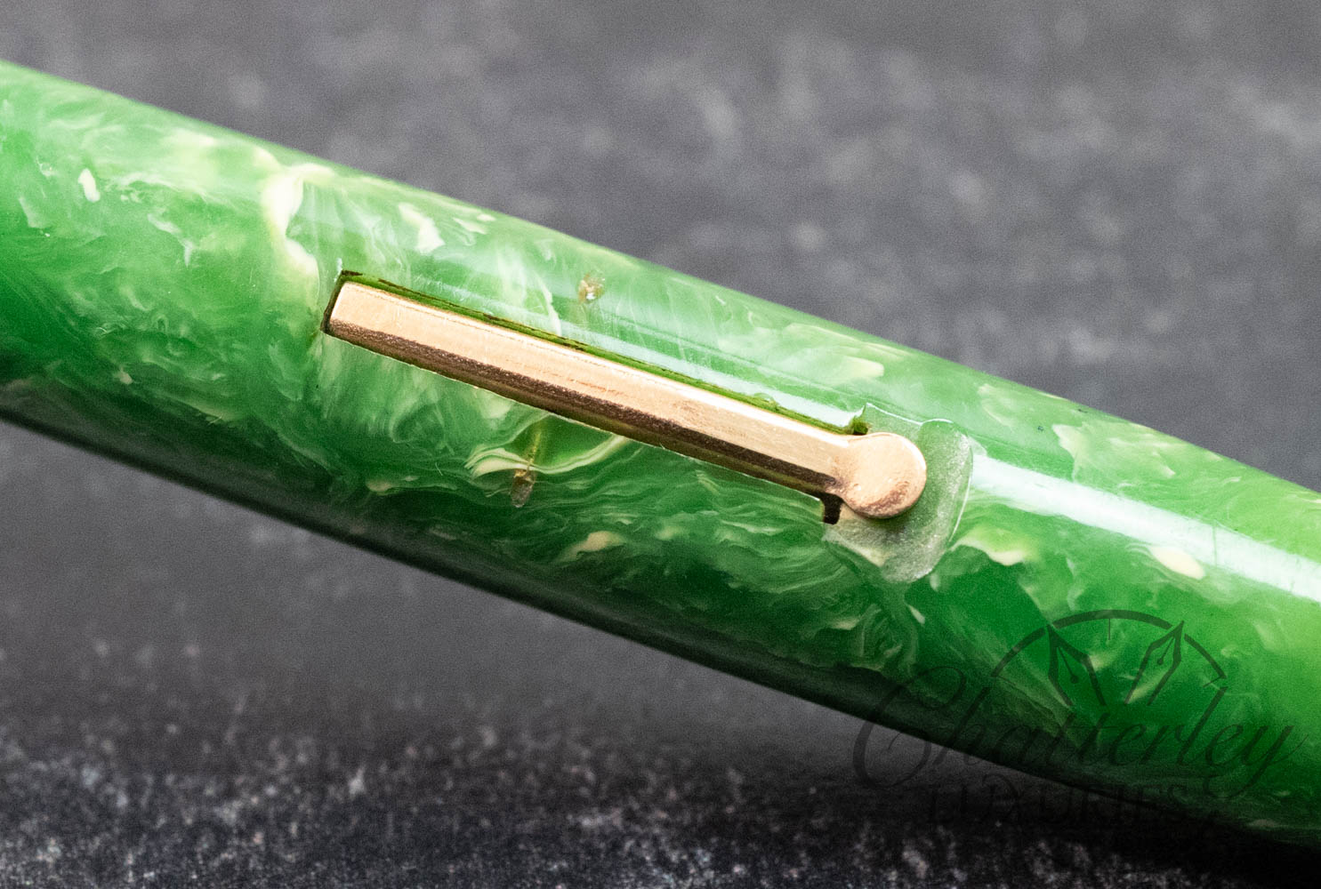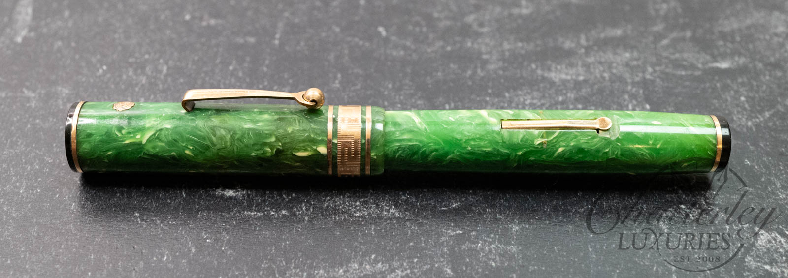 The Decoband was Wahl-Eversharp’s flagship model during the late 1920s and early 1930s. The Manifold nib was designed for firm, durable writing—originally intended for use with carbon copies. This version is crafted from Wahl’s striking Jade Green celluloid, known for its rich swirls and bright, pearlescent character. Each pen made from this material is visually unique.