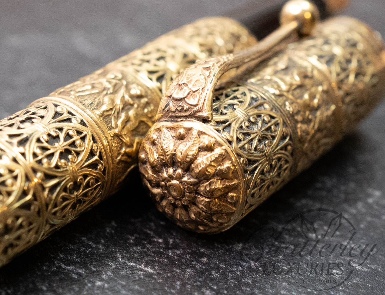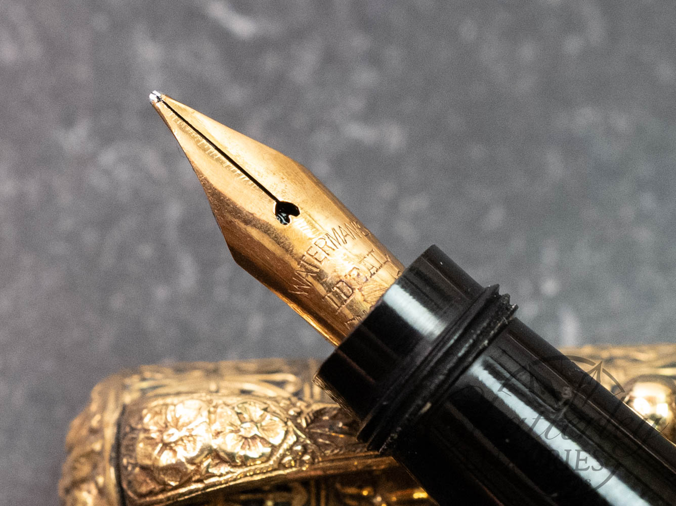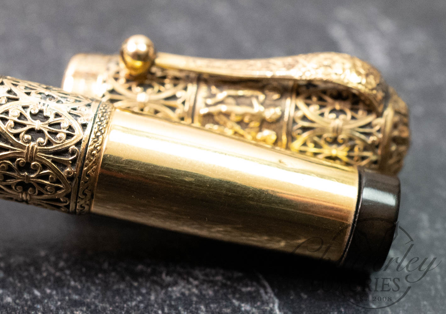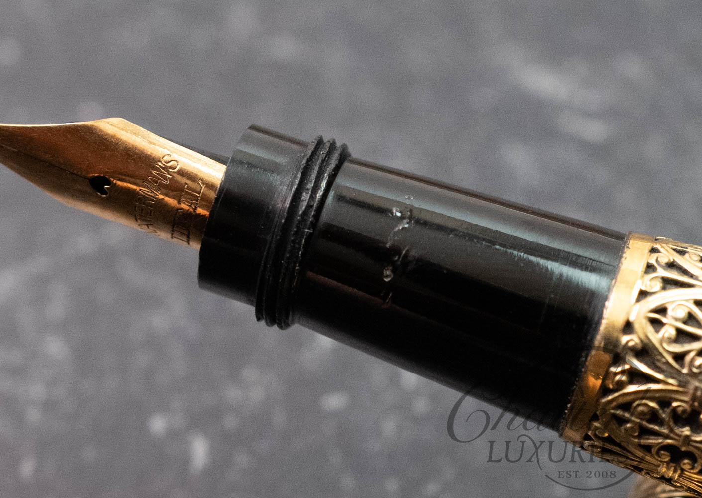 This vintage pen is close to 100 years old, it has seen regular use and shows signs of having been lovingly owned through the years. There are some clear signs of surface wear, with scratches on the section and piston knob (see last 2 images). It is equipped with a 14k Broad Waterman’s Ideal nib that’s writes very wet, almost a Double Broad. It fills via Eye Dropper and the trim, cap and body are rolled 18ct gold. (Writing Sample at the bottom). Having an “open filigree” refers to a style of decorative metal overlay—typically sterling silver or gold-filled—that is pierced, lacy, or cut through. Instead of a solid metal casing, the filigree pattern features openings that allow the base material of the pen (usually black hard rubber, or sometimes celluloid) to show through underneath.