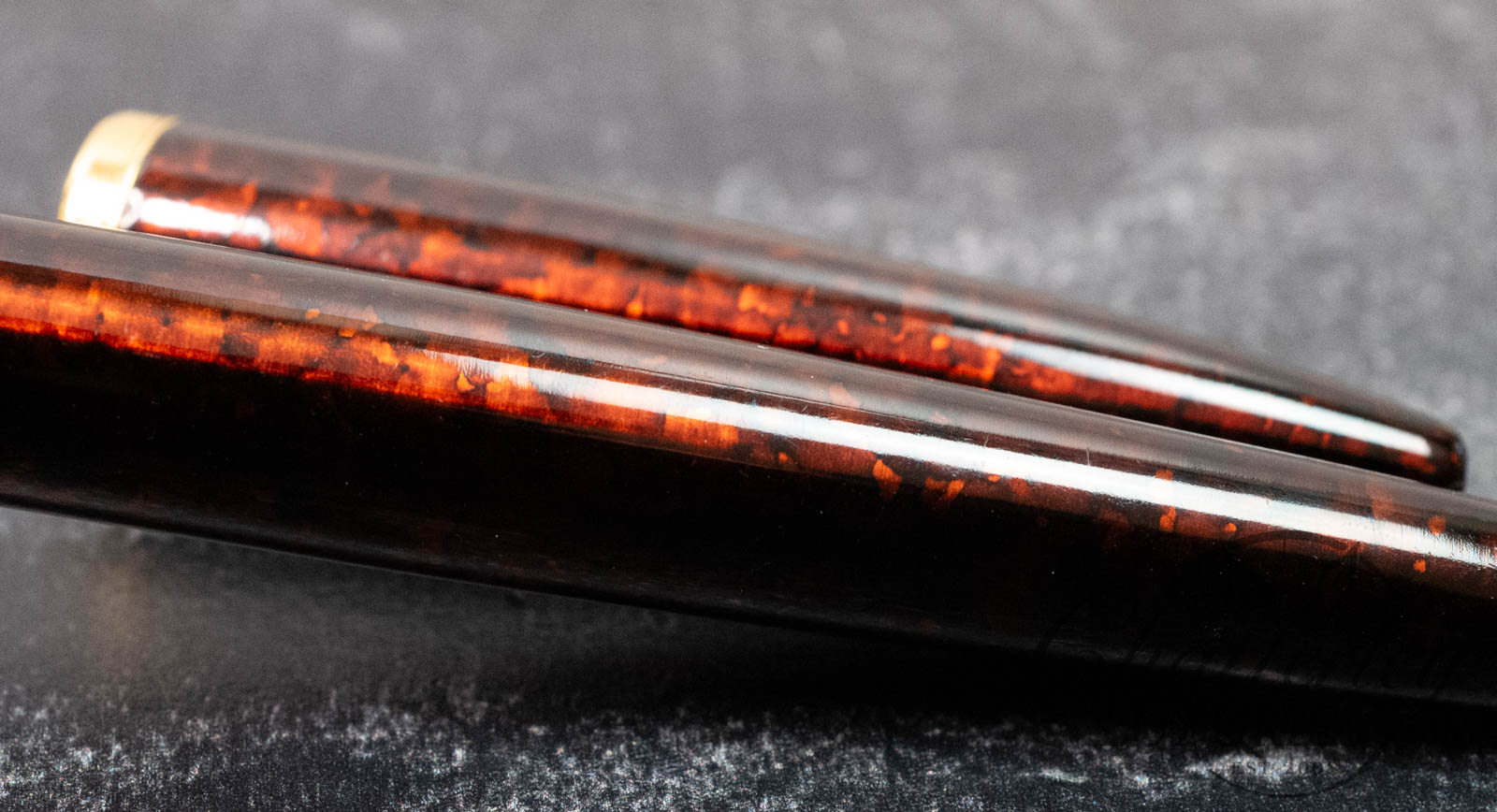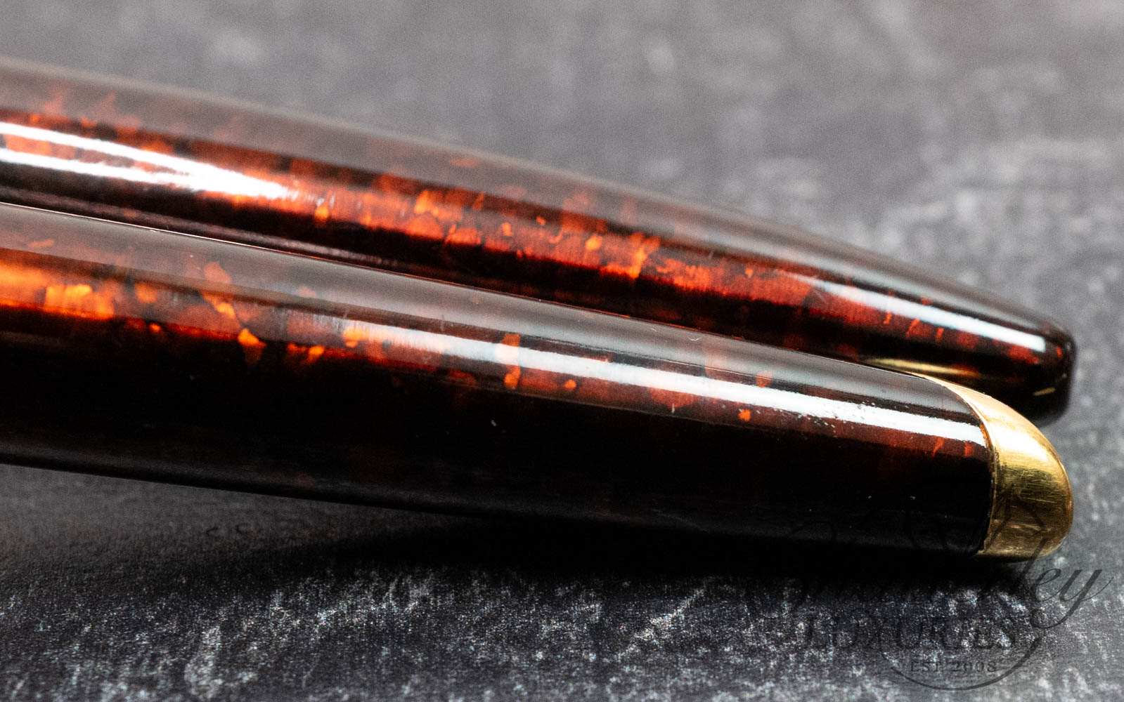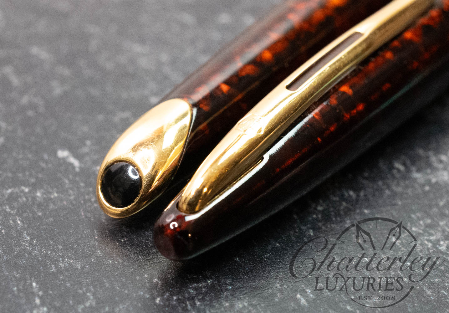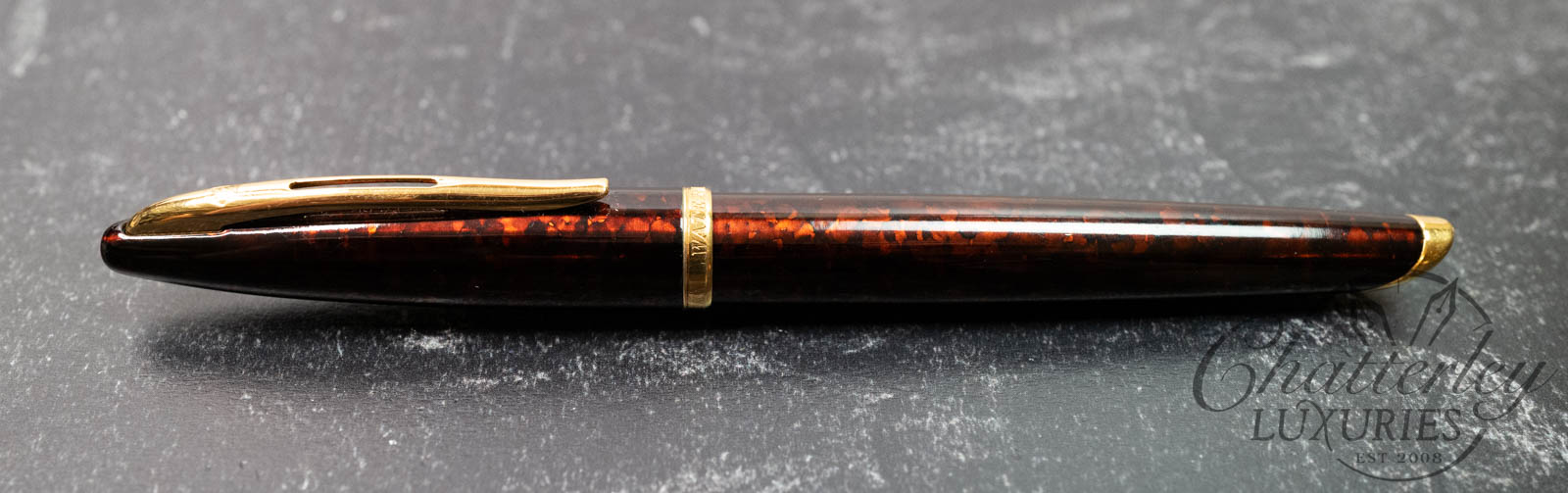 This pen is lovingly used and does not come with a box or papers. It is equipped with an 18k Fine nib and fills via cartridge converter (included).