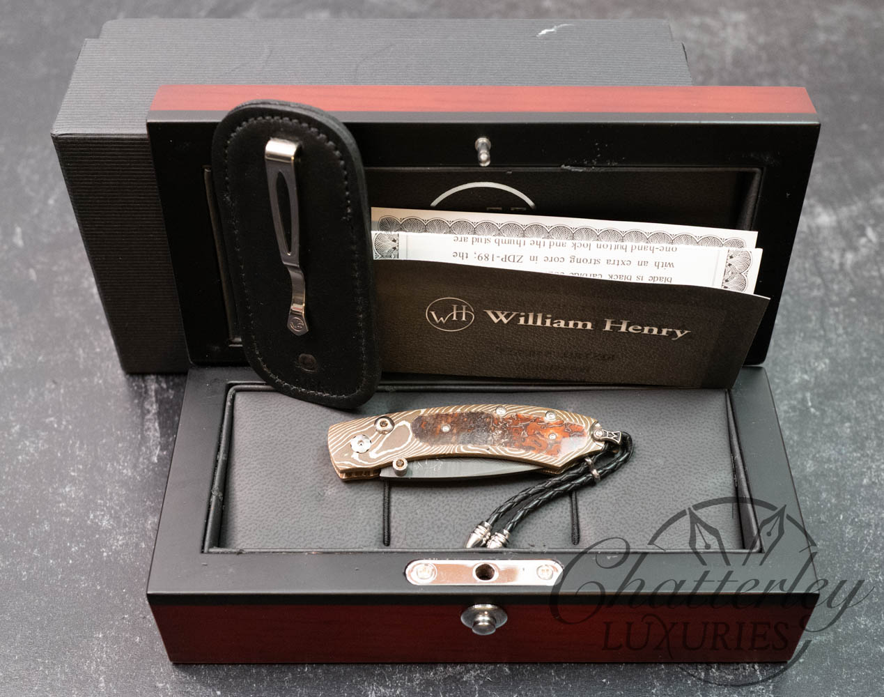 This Folding Knife is Pre-owned and in excellent, like-new condition. It comes complete with its box and papers as well as a William Henry black leather ClipCase.