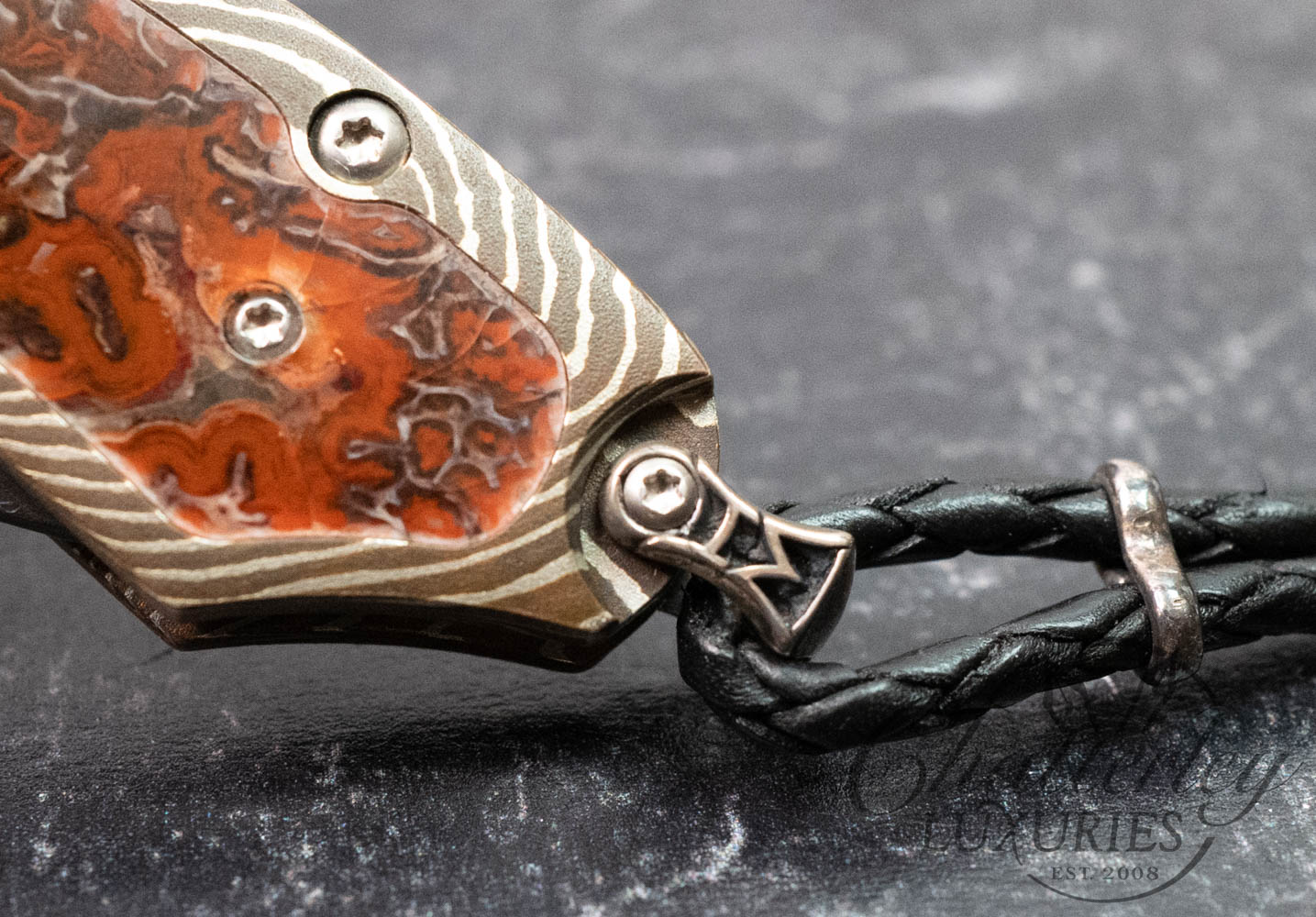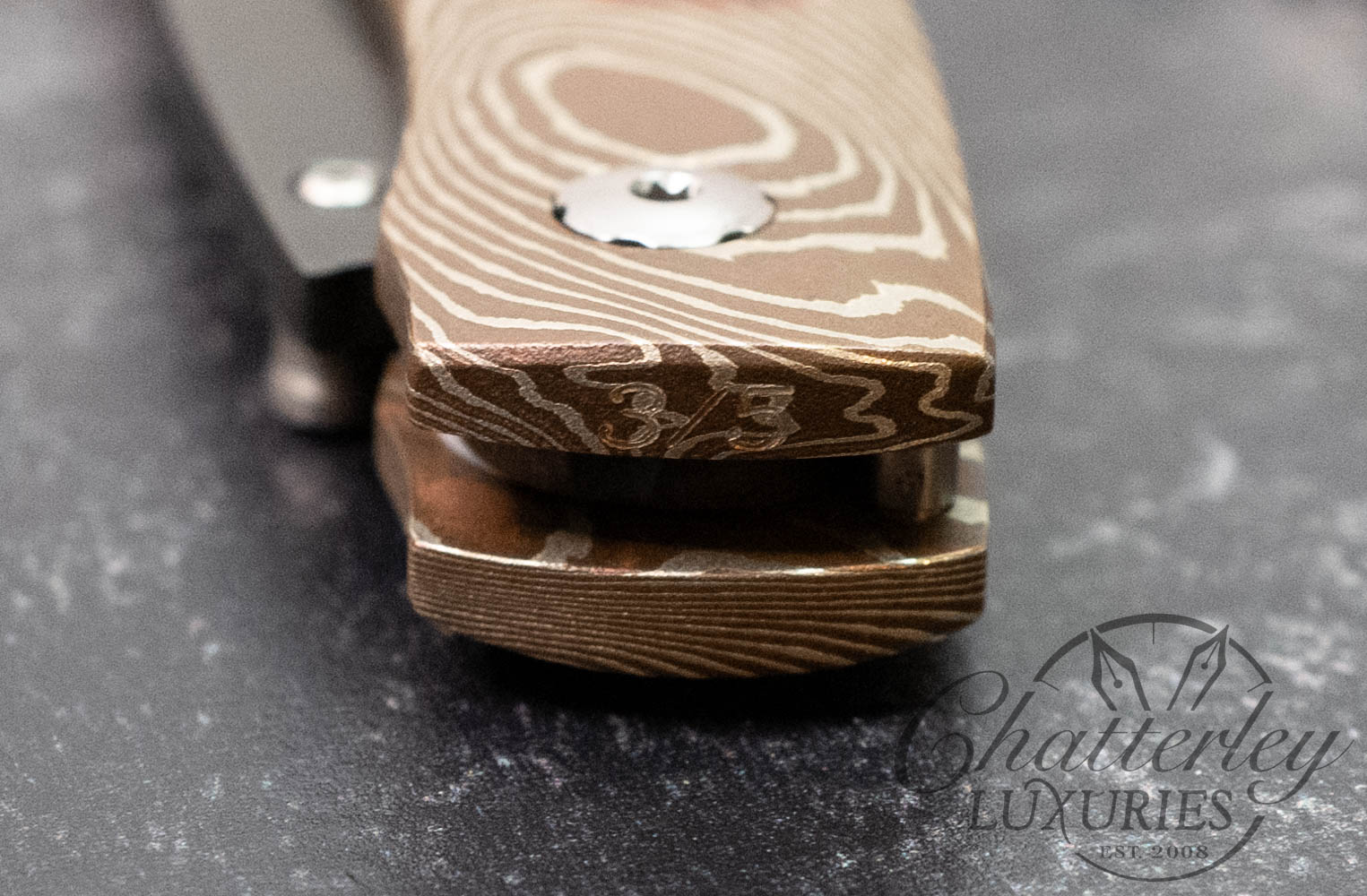 The blade is black carbide-coated ‘wave’ damascus with an extra strong core in ZDP-189; the one-hand button lock and the thumb stud are set with smokey quartz. The Kestrel is a compact but versatile folder that works and presents beautifully in any situation. The deep finger groove at the intersection between the handle and blade makes this knife remarkably comfortable in the hand while being very small and easy to carry.