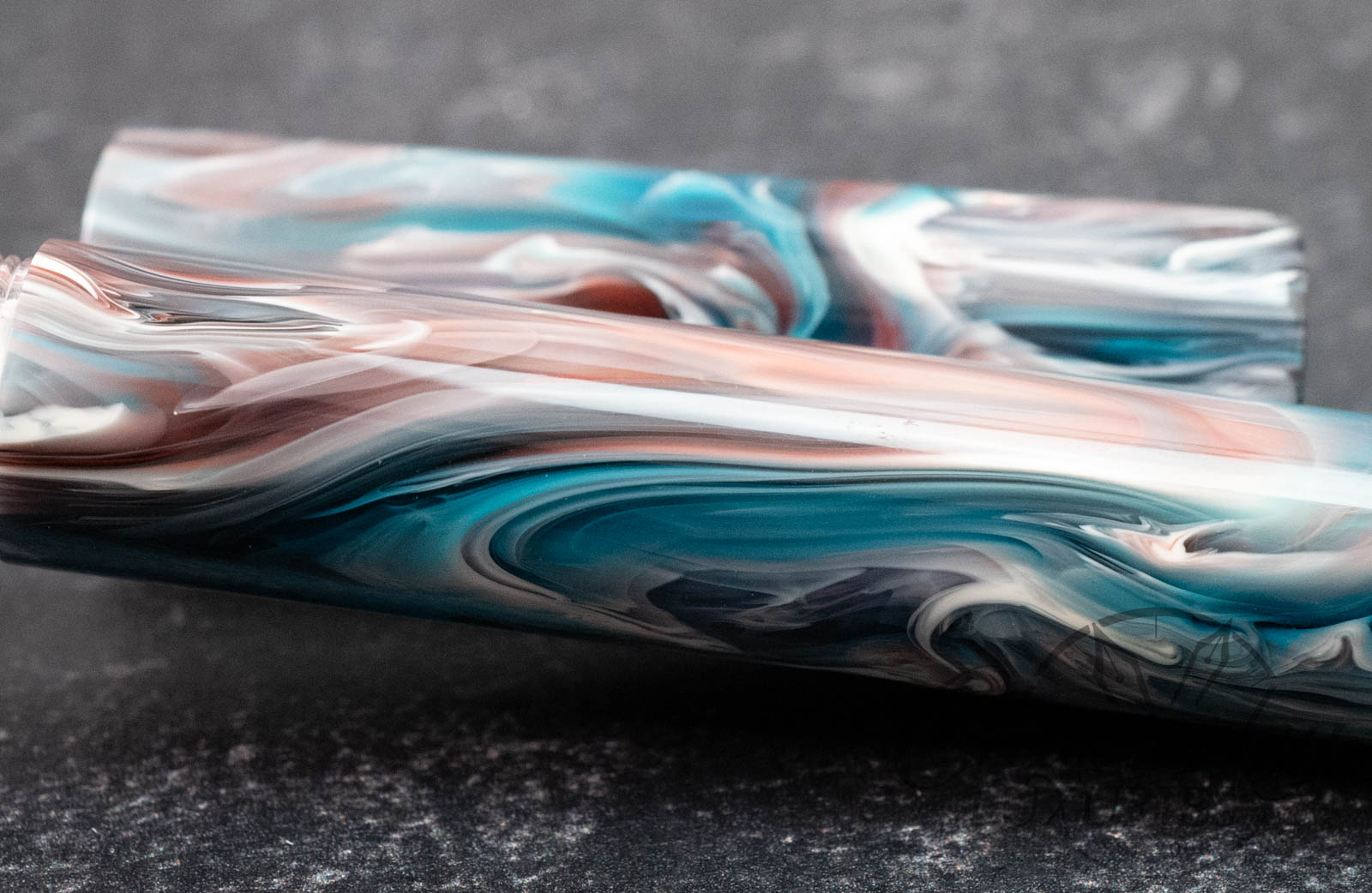 This pen is lovingly used and does not come with a box or papers. It is equipped with a Steel Fine nib and fills via cartridge convertor (included). The resin comes from Jonathon Brooks of the Carolina Pen Company.