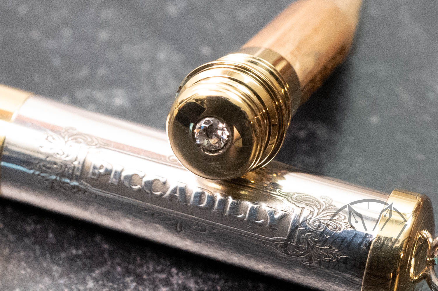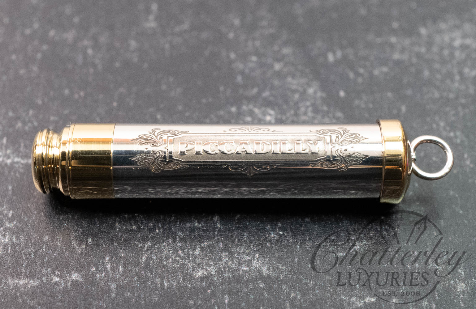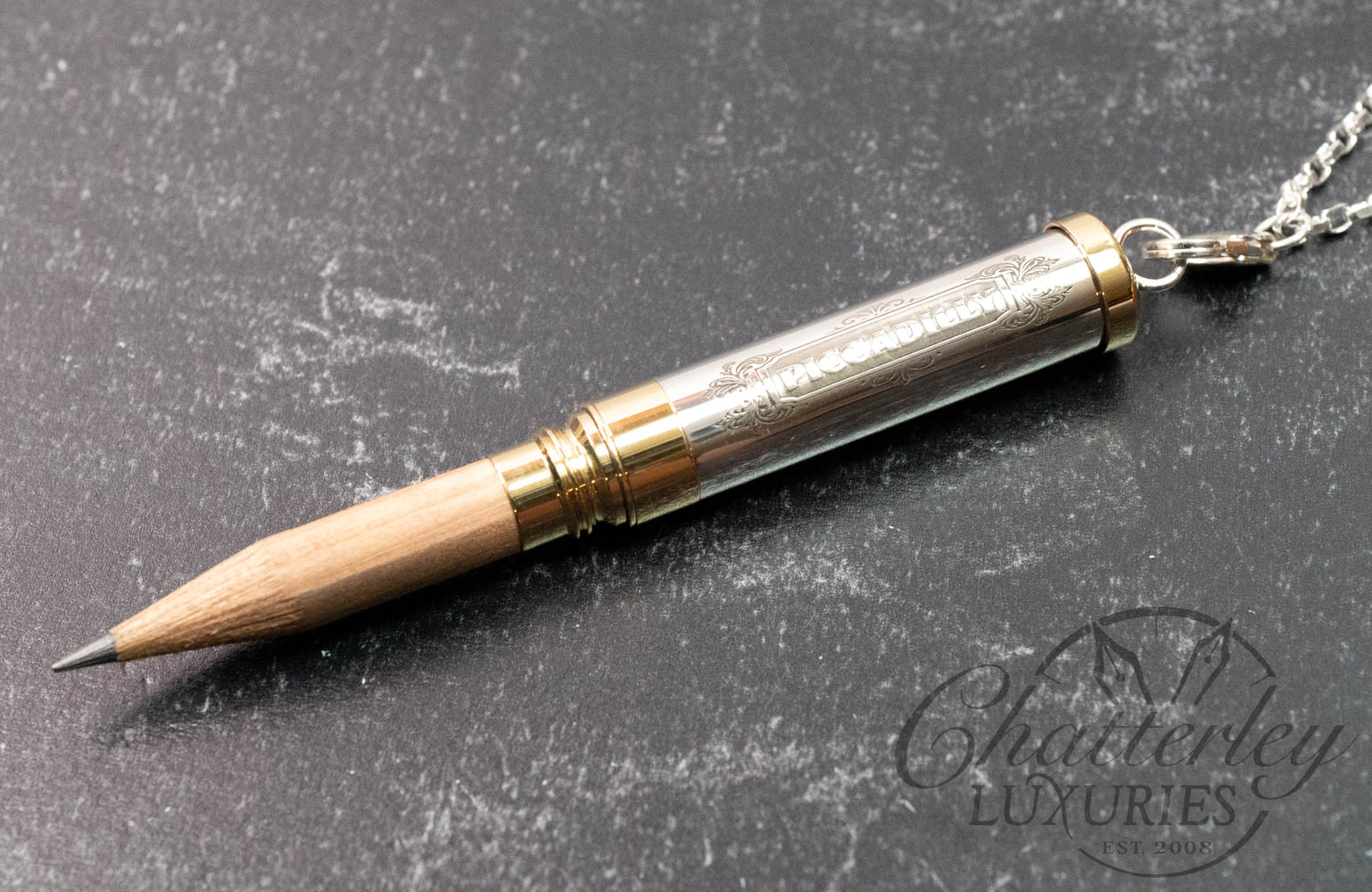 The Piccadilly Necklace is compact, at 2 inches long and hung on a sterling silver chain. The sterling silver barrel is hallmarked and topped and tailed in a brass trim. Available in three designs – a hand-chased Rose or Victorian or Barley engine-turned pattern each come embellished with the gem in the cap in either pink, green or clear. It comes with 2 pencil refills.