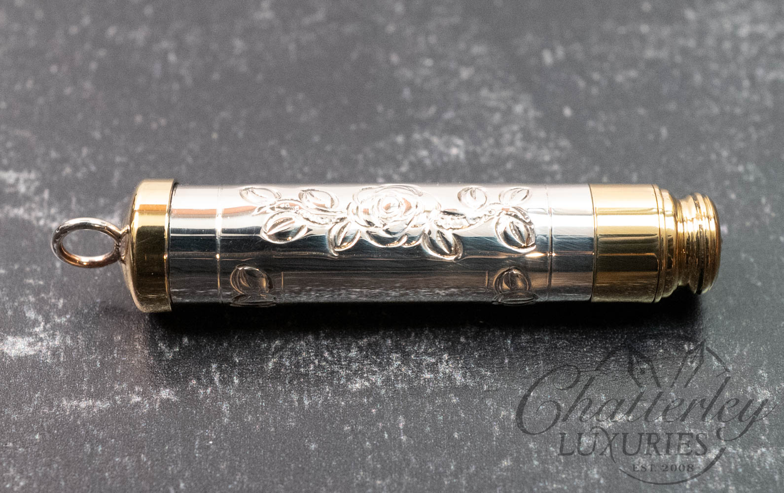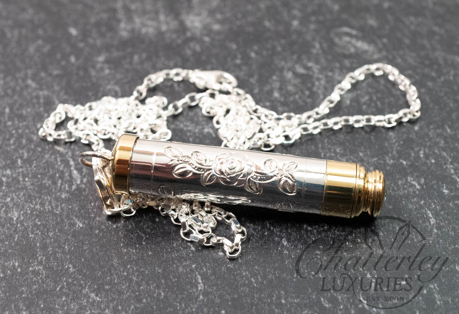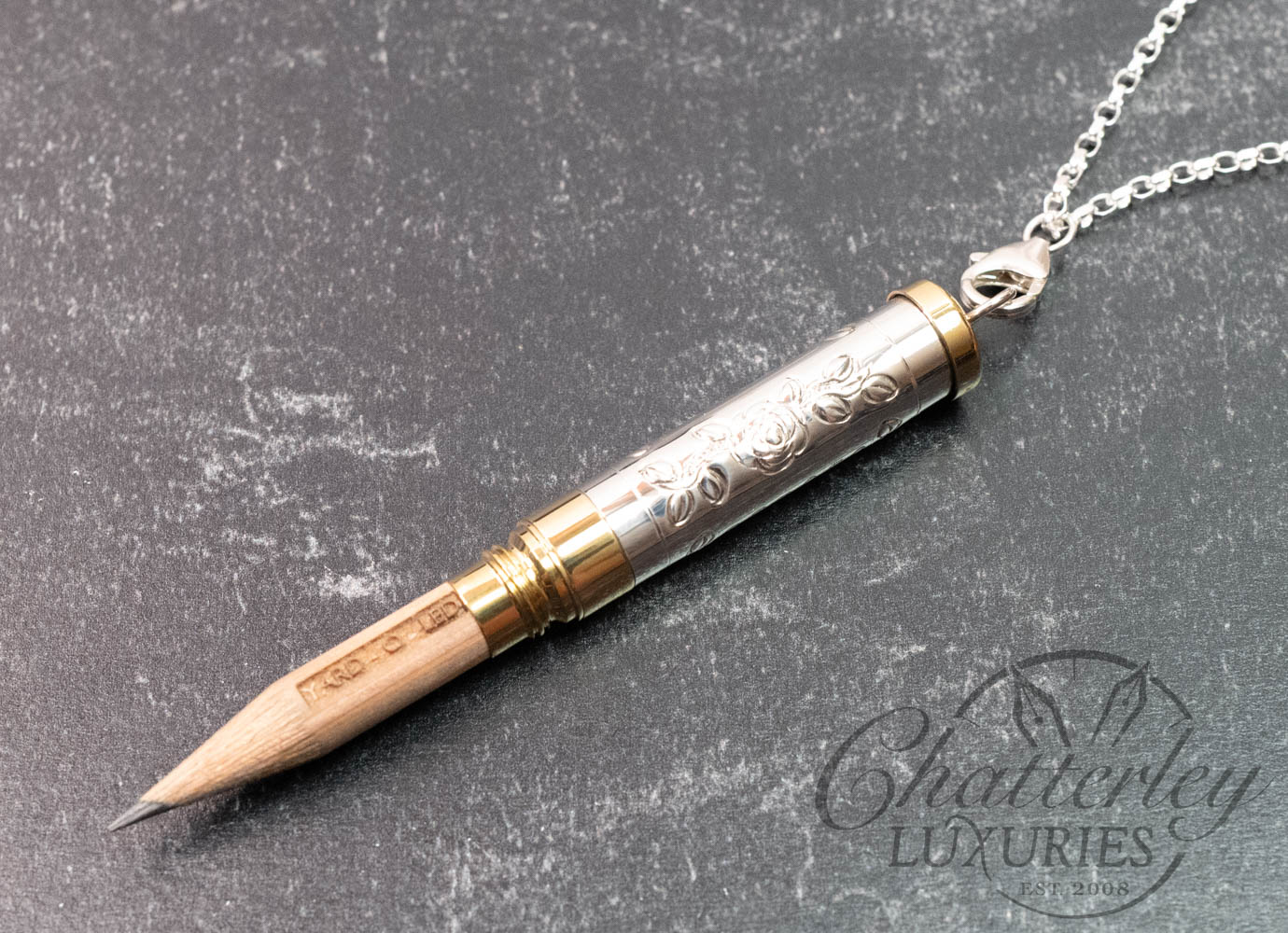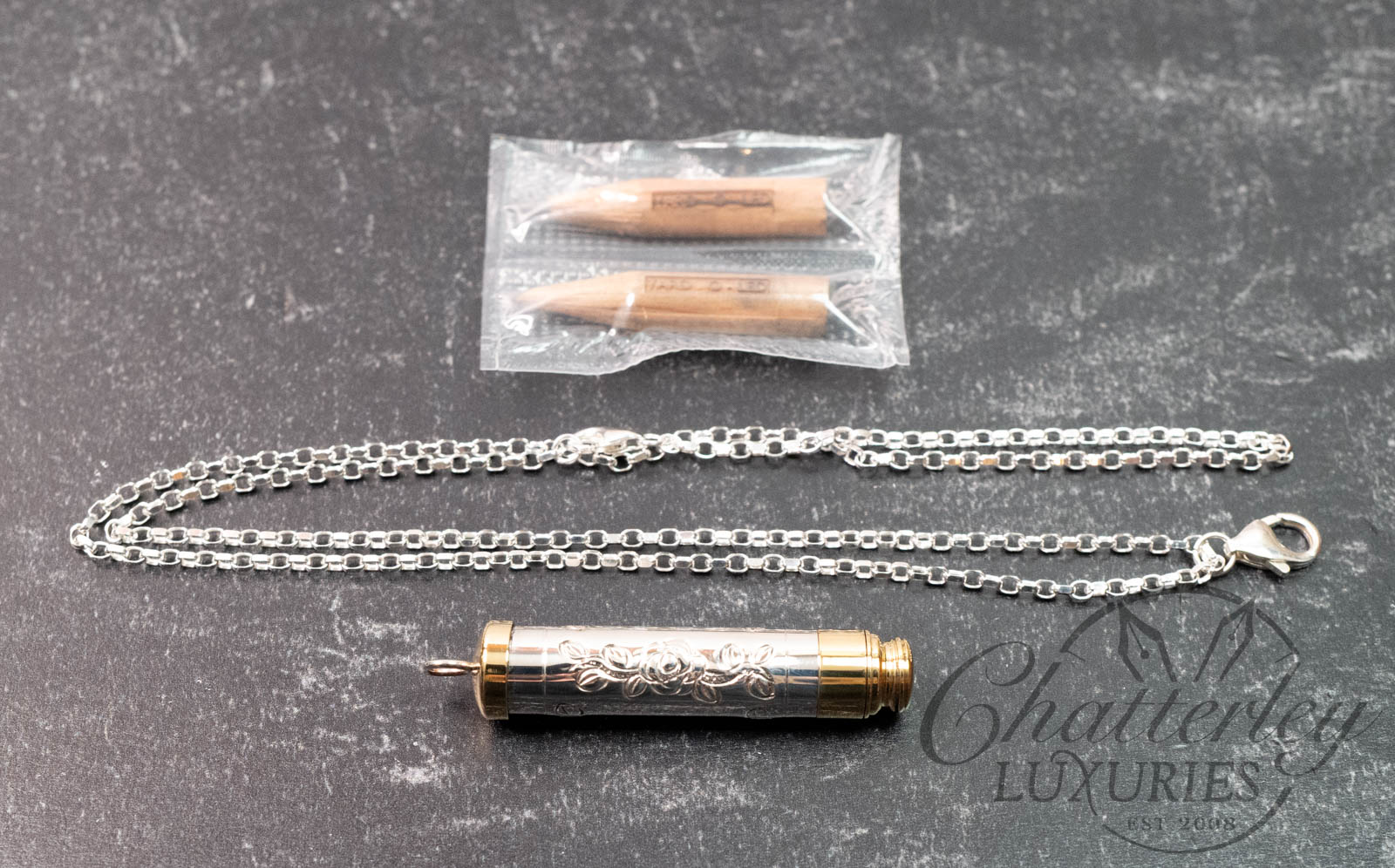 The Piccadilly Necklace is compact, at 2 inches long and hung on a sterling silver chain. The sterling silver barrel is hallmarked and topped and tailed in a brass trim. Available in three designs – a hand-chased Rose or Victorian or Barley engine-turned pattern each come embellished with the gem in the cap in either pink, green or clear. It comes with 2 pencil refills.