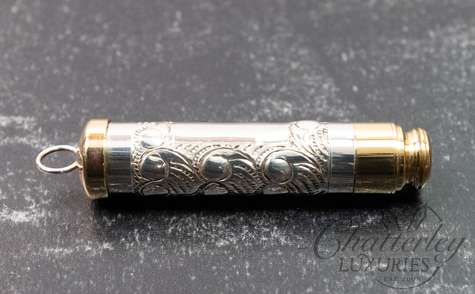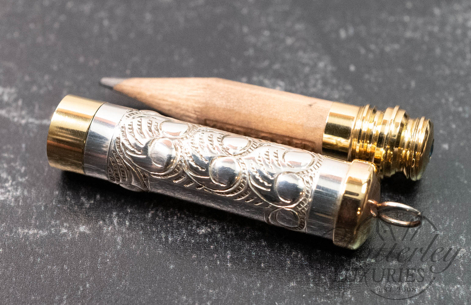 The Piccadilly Necklace is compact, at 2 inches long and hung on a sterling silver chain. The sterling silver barrel is hallmarked and topped and tailed in a brass trim. Available in three designs – a hand-chased Rose or Victorian or Barley engine-turned pattern each come embellished with the gem in the cap in either pink, green or clear. It comes with 2 pencil refills.
