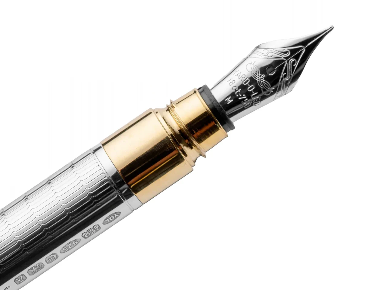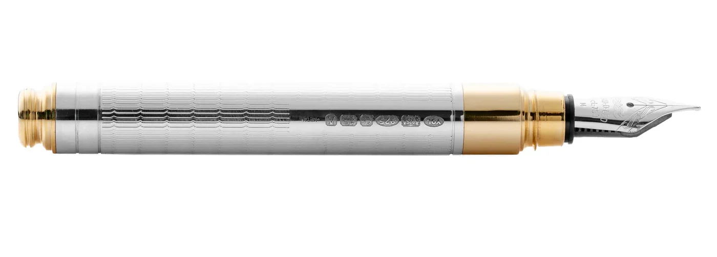 Handmade in sterling silver in the historic Birmingham workshop and edged in a golden brass trim to highlight the barrel it is exquisitely topped with a hand set enamelled coin at the base of the pen.