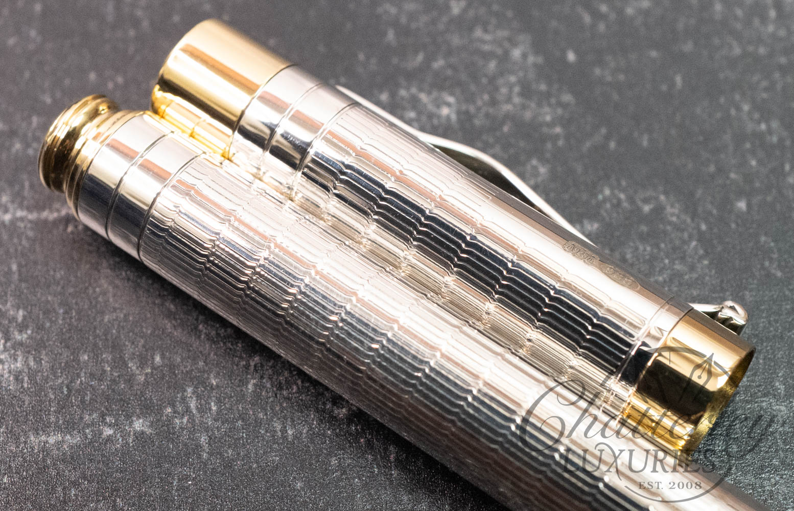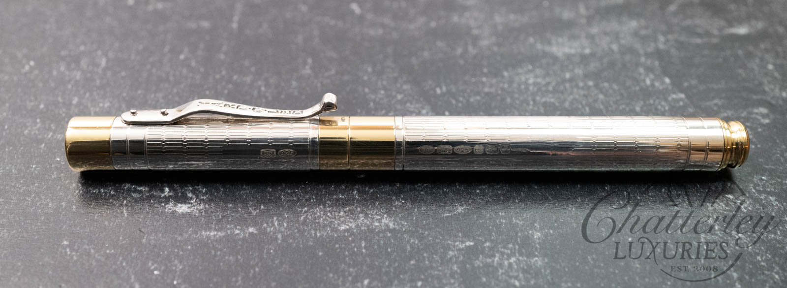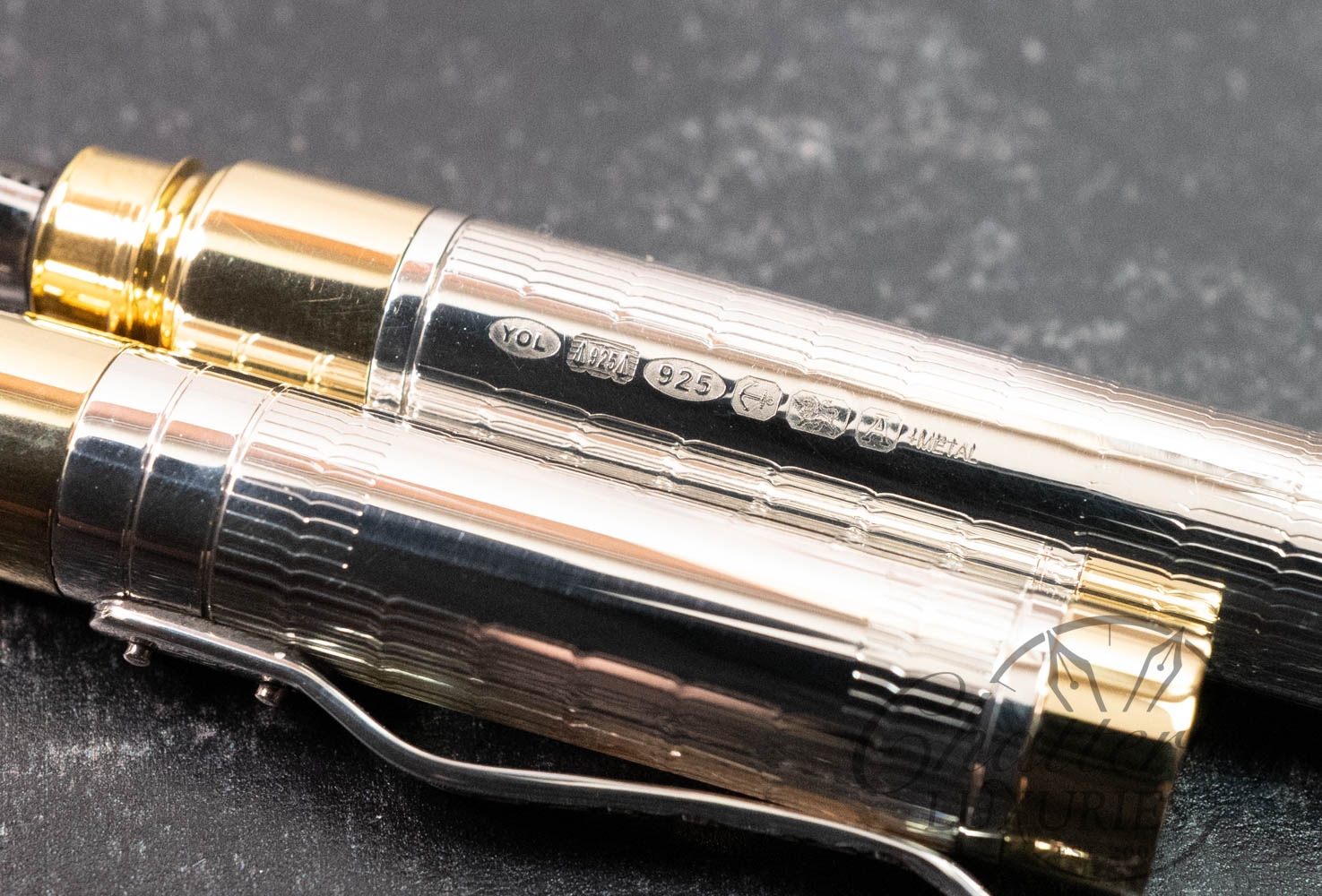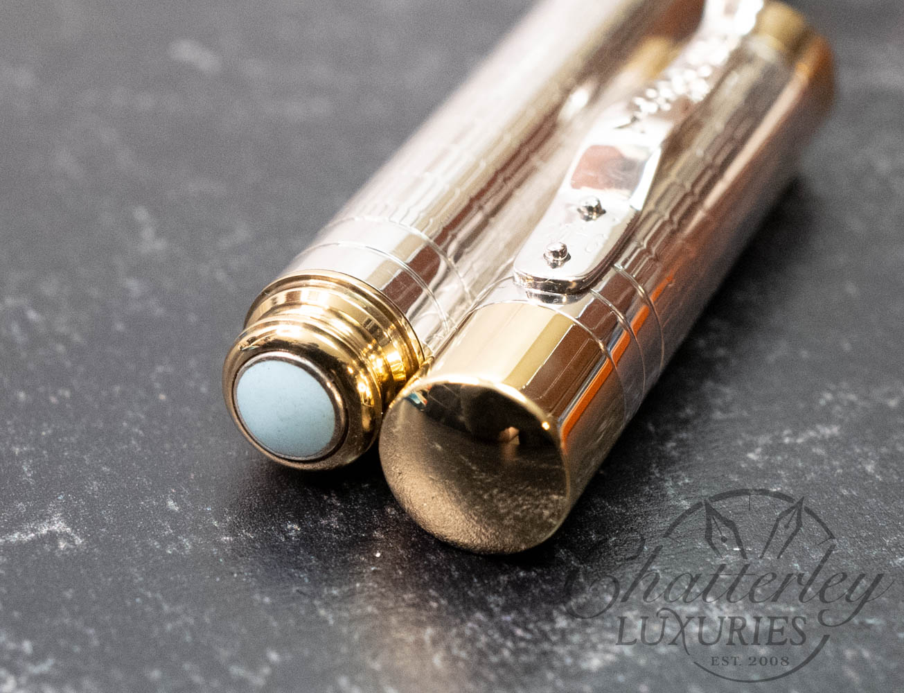 Handmade in sterling silver in the historic Birmingham workshop and edged in a golden brass trim to highlight the barrel it is exquisitely topped with a hand set enamelled coin at the base of the pen.